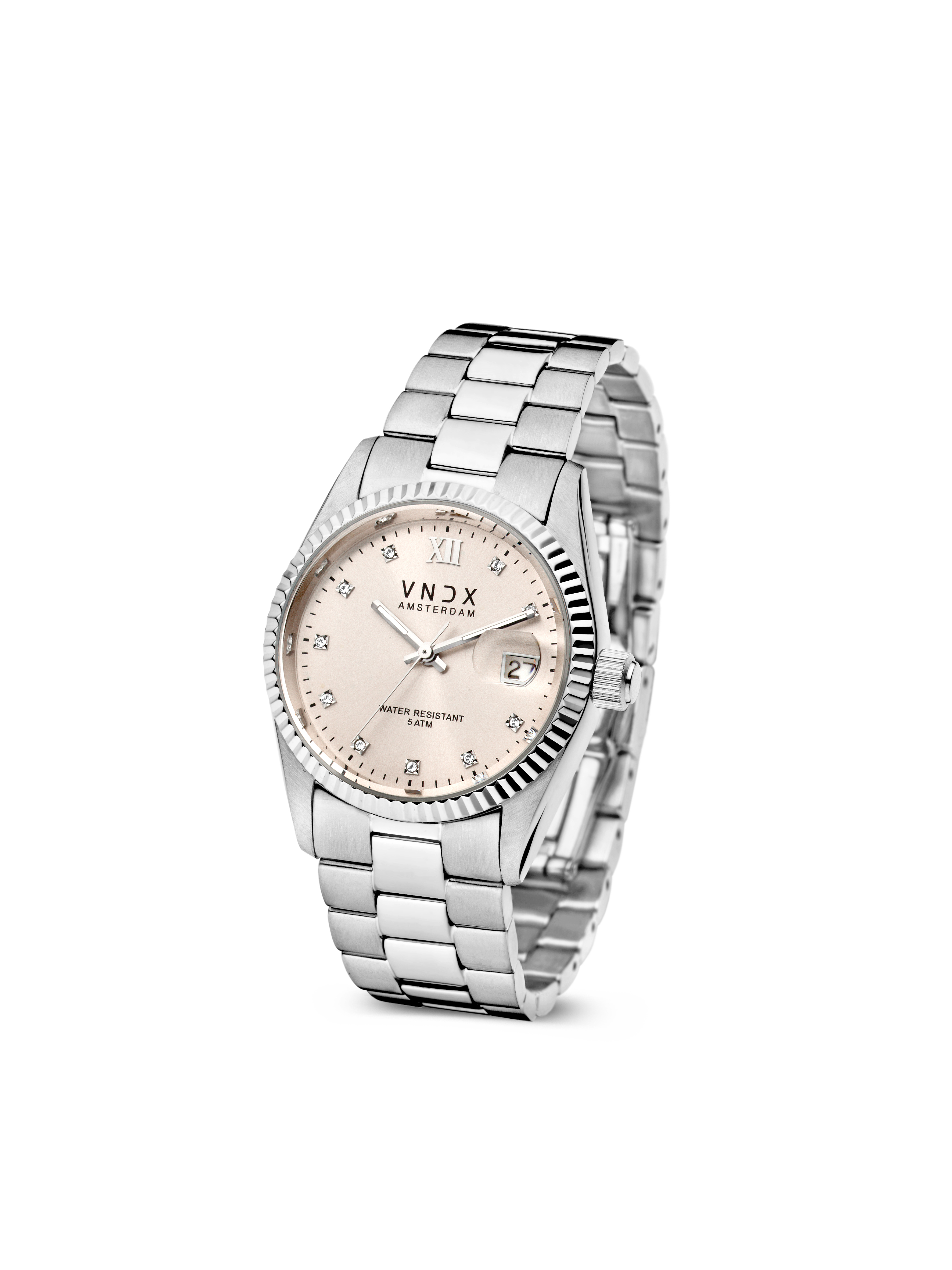 De Dare Devil Medium Rose, het horloge dat tot in detail is gemaakt om perfect op je pols te vallen. De diameter van haar kast is 36 mm kwaliteit en daarmee de perfecte Medium. Met haar roestvrijstalen schakelband kun je de Dare Devil perfect aanpassen op jouw polsmaat, zo ben jij één met je horloge.