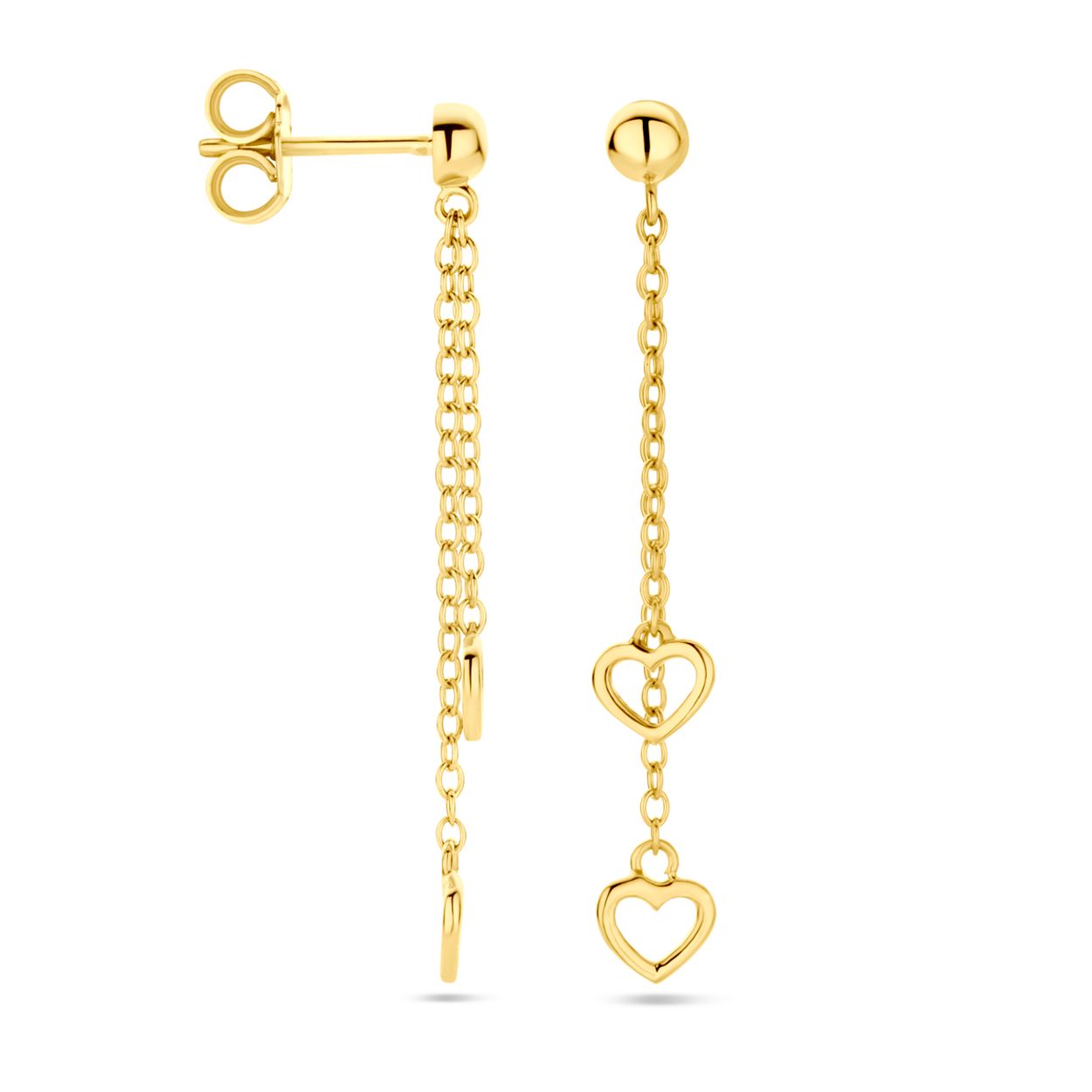 14k Geelgouden oorhangers uitgevoerd met hartjes. De oorhangers hebben een totale hoogte van 36mm.