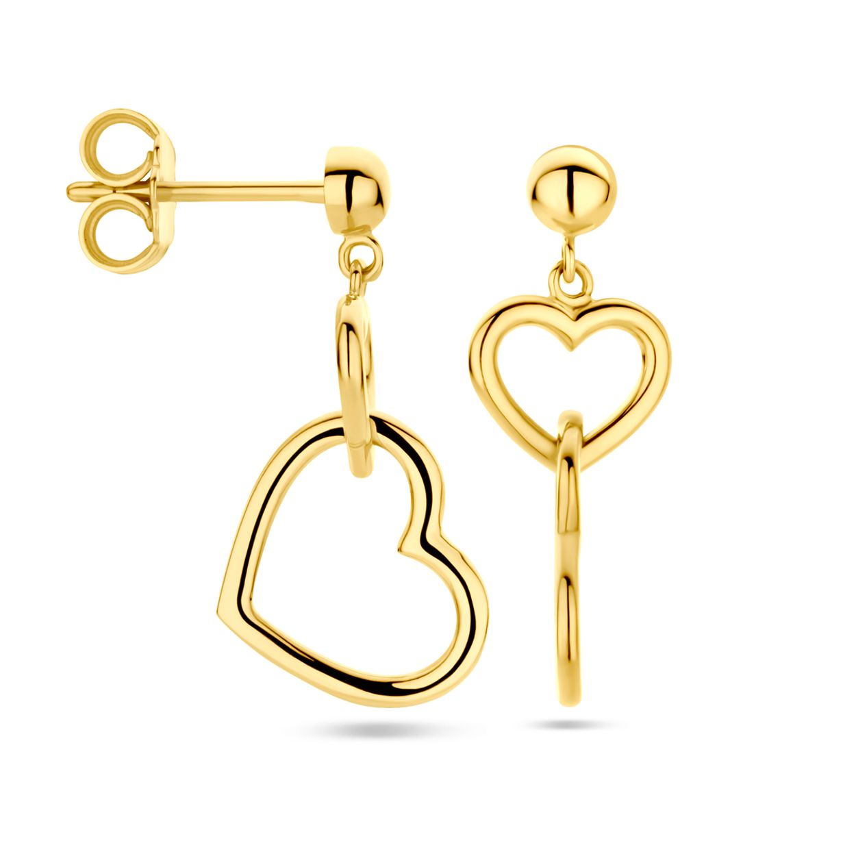 14k Geelgouden oorhangers uitgevoerd met twee harten. De oorhangers hebben een totale hoogte van 22mm.