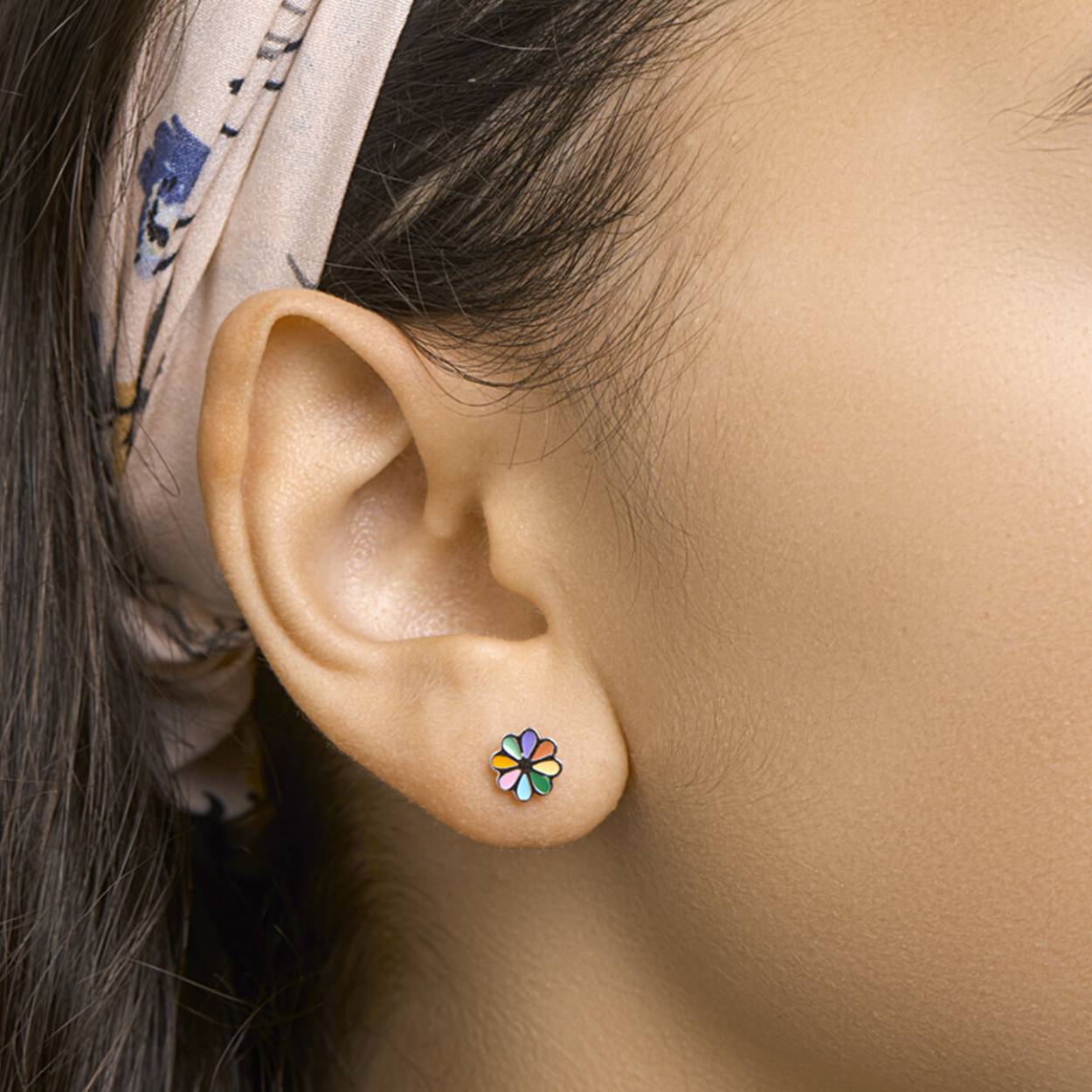 Gerhodineerd zilveren bloem oorknoppen uitgevoerd met verschillende kleuren emaille. De oorknoppen hebben een diameter van 7mm. U kunt deze oorknoppen combineren met bijpassende sieraden uit onze collectie.