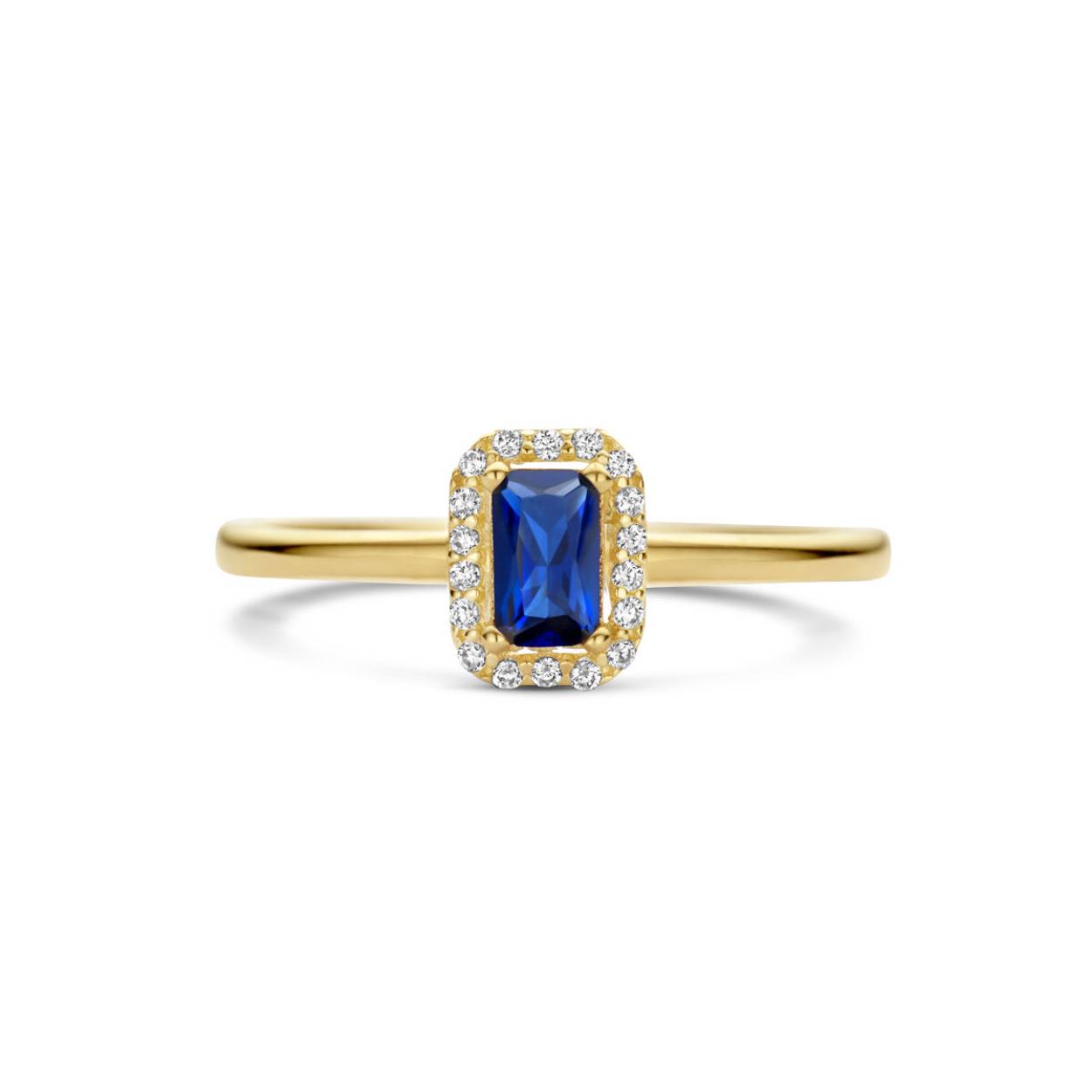 14k Geelgouden ring uitgevoerd met schitterende saffier en zirkonia. De ring heeft een breedte van 7.5mm.