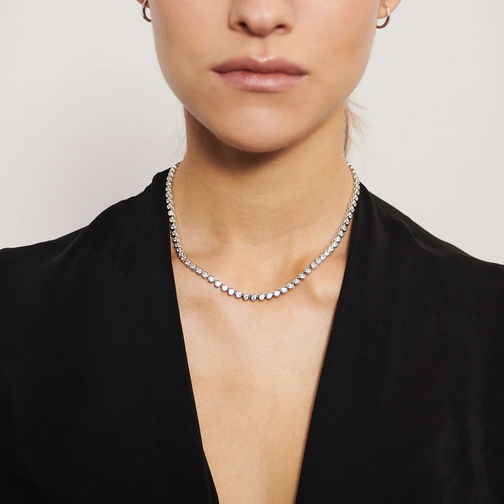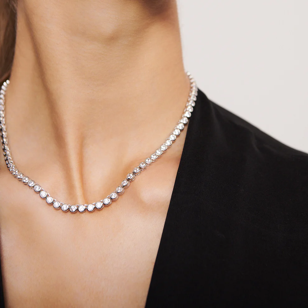Necklace made of 925 Sterling silver with rhodium, polished surface and facet cut white zirconia.