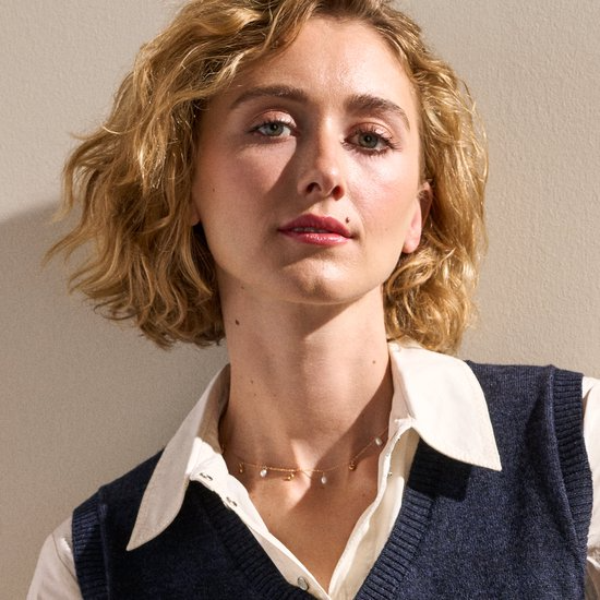 Een gepolijste, goudkleurige roestvrijstalen ketting wordt geaccentueerd met zoetwaterparels en goudkleurige steentjes, vastgezet met een karabijnsluiting voor ingetogen elegantie en draagcomfort.