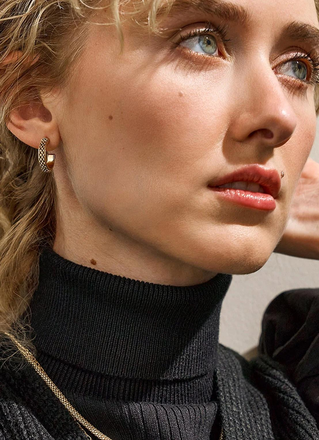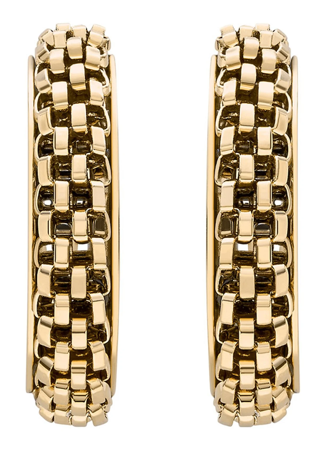 Deze hoepeloorbellen zijn gemaakt van goudkleurig roestvrij staal. Met sluiting achter het oor.