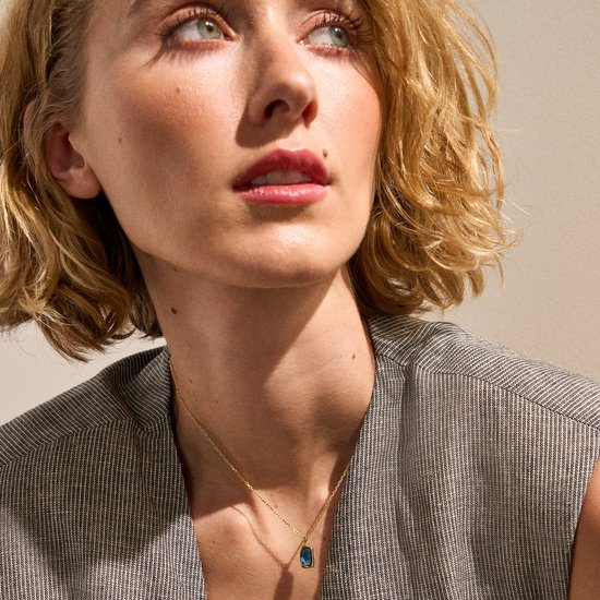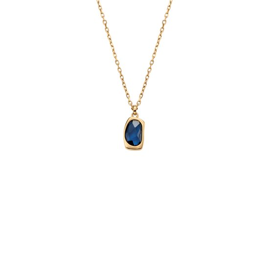 Een gepolijste goudkleurige roestvrijstalen ketting omlijst een op blauw zeeglas geïnspireerde licht transparante hanger met organische rondingen. Afgewerkt met een karabijnsluiting om hem veilig te kunnen dragen.