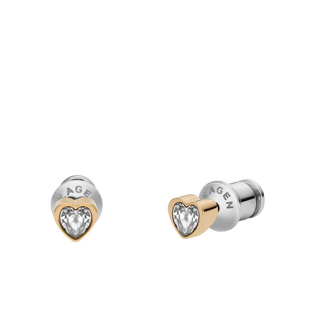 Deze set bestaat uit een goudkleurige roestvrijstalen hangende halsketting met een karabijnsluiting en goudkleurige roestvrijstalen glitteroorknopjes met hartjes en paalsluitingen, beide geaccentueerd met kristallen.