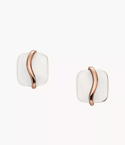 These organic-shaped white sea glass stud earrings feature a rose-tone stainless steel wave pattern. These feature butterfly post closures.