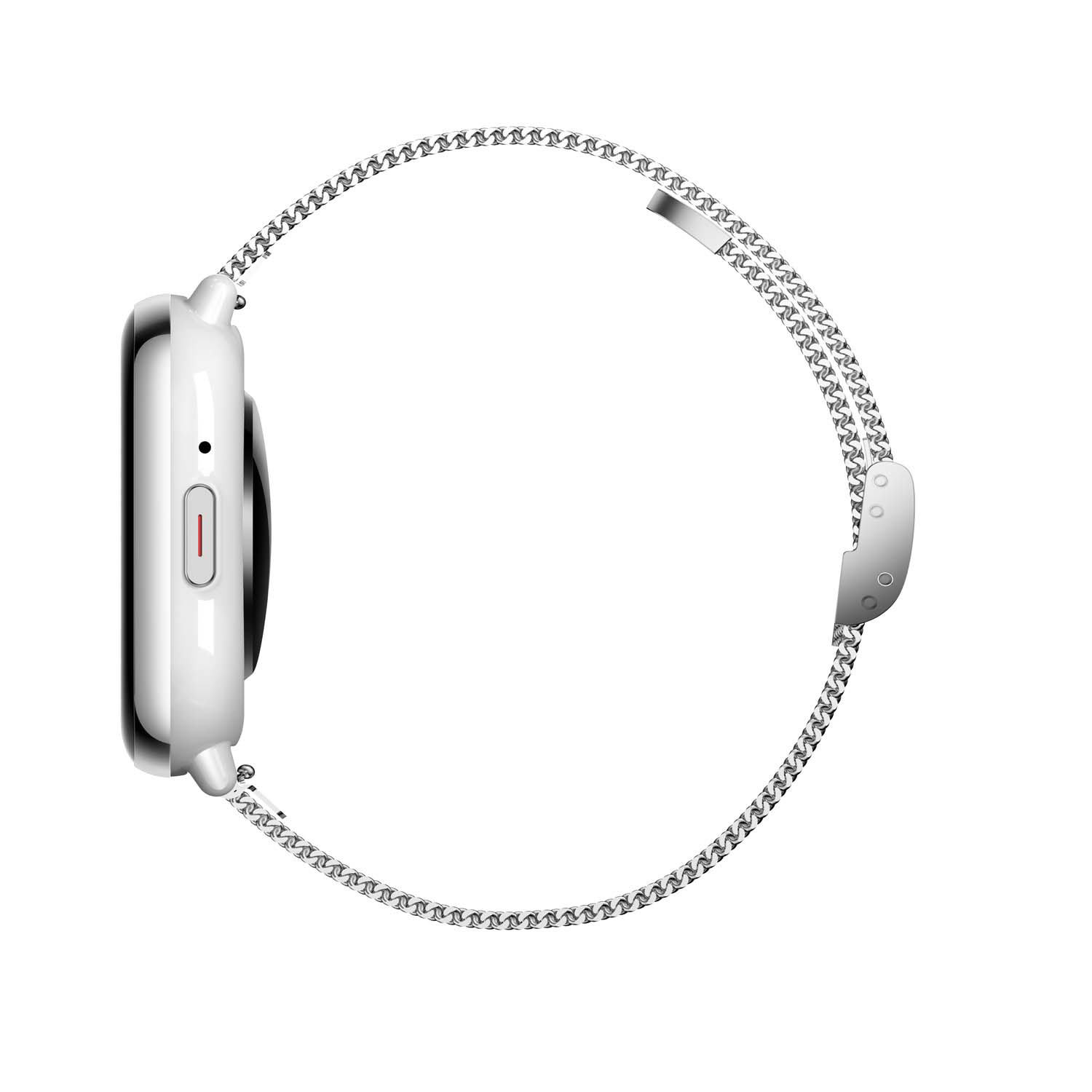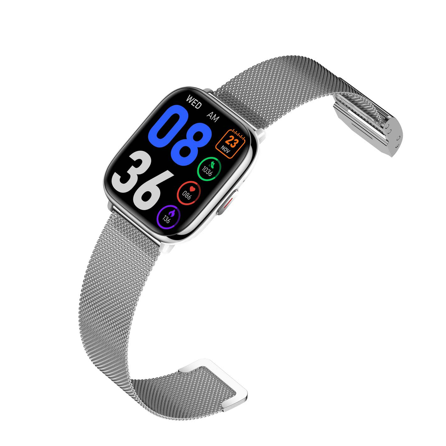 Dit Smarty Smartwatch horloge is een stap in de toekomst. Door zijn Amoled scherm is het beeld vele malen scherper en intenser. De zilverkleurige kast is gemaakt van aluminium met een gehard glas. Aan de kast zit een zilverkleurige mesh band met een druksluiting. Het rechthoekige horloge heeft een afmeting van 40x35x11mm en is spatwaterdicht. Deze smartwatch is sportief, stijlvol, maar zeker gebruiksvriendelijk. Om door apps, berichten en tekst te bladeren hoeft je alleen maar op het glas te tikken of de knop te gebruiken. Tevens heeft het een Find my watch functie.