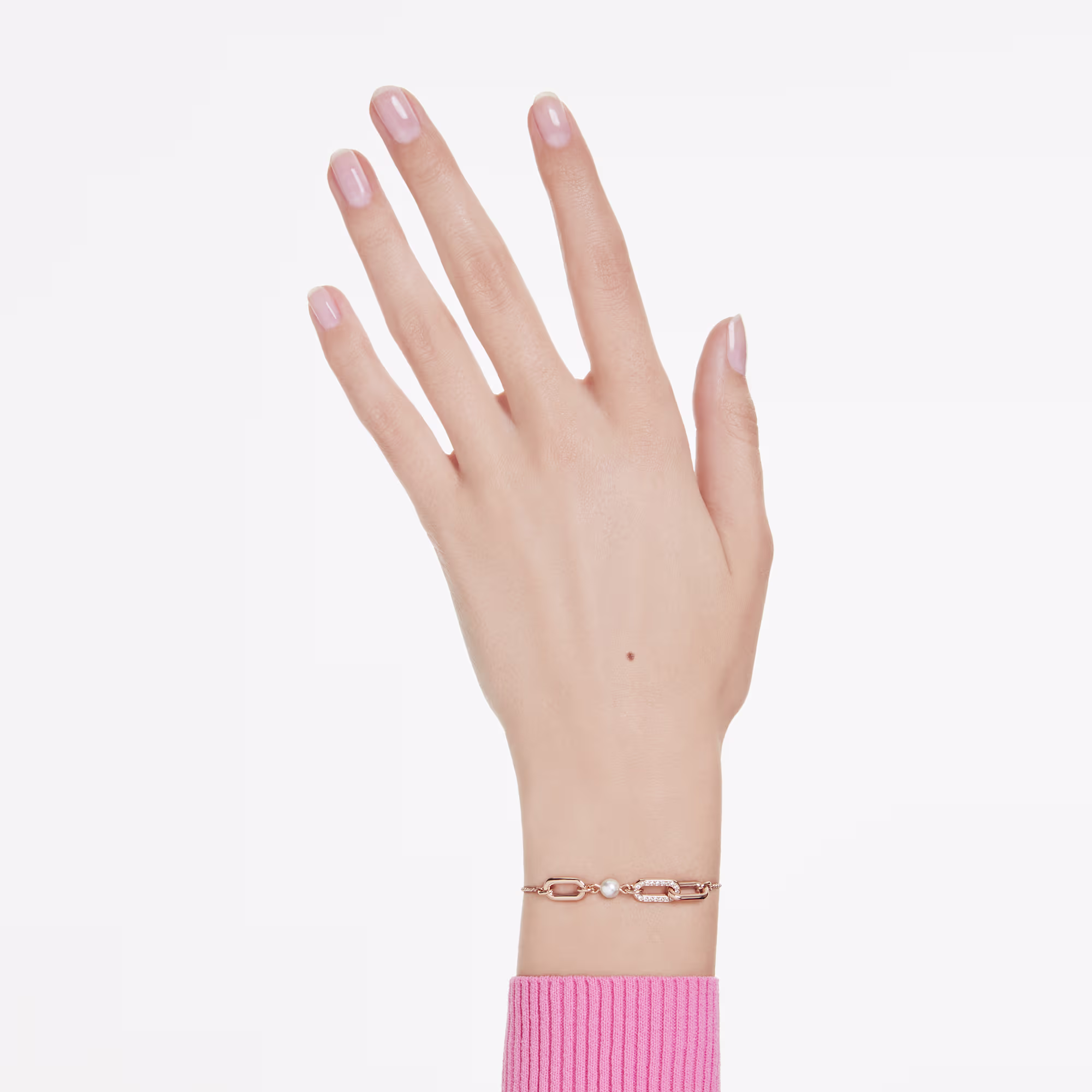 Deze Constella-armband, ontworpen voor pure elegantie, heeft een roségoudkleurige toplaag en twee met elkaar verbonden schakels, waarvan één is versierd met een heldere pavé. Een enkele Swarovski Crystal Pearl hangt er delicaat onder, terwijl de schuifsluiting zorgt voor een verstelbare pasvorm. Combineer deze armband met bijpassende oorbellen of een hanger uit dezelfde lijn voor een harmonieuze look.