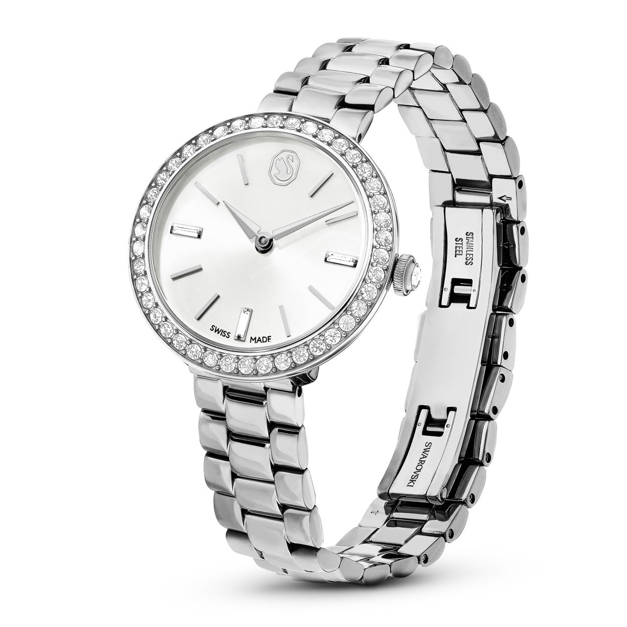 Dit Certa-horloge combineert de stralende glinstering van Swarovski met eigentijds design en is de perfecte combinatie van vakmanschap en functionaliteit. De edelstalen kast van 30 mm is voorzien van een lunette bezet met een glinsterend pav� van 42 kristallen. Op de stralende sunray wijzerplaat met zonnestraalpatroon prijken een elegant zwaanlogo ter hoogte van de 12 en drie uuraanduidingen met kristallen in Baguette-slijpvorm. In de kroon is een kristal gezet en de metalen armband met drie schakels zit comfortabel om de pols. Dit Swiss Made horloge is waterbestendig tot 50 meter en vormt een tijdloze keuze als aanvulling op uw dagelijkse stijl.