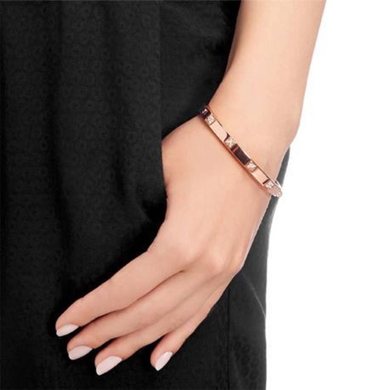 Perfect voor modeliefhebbers! Deze rosegouden PVD-armband is een eerbetoon aan de trends van dunne bangles en spikes. Het design is verfraaid met heldere kristallen pavé en makkelijk te combineren met andere bangles of armbanden om een trendy gestapelde look te creëren.