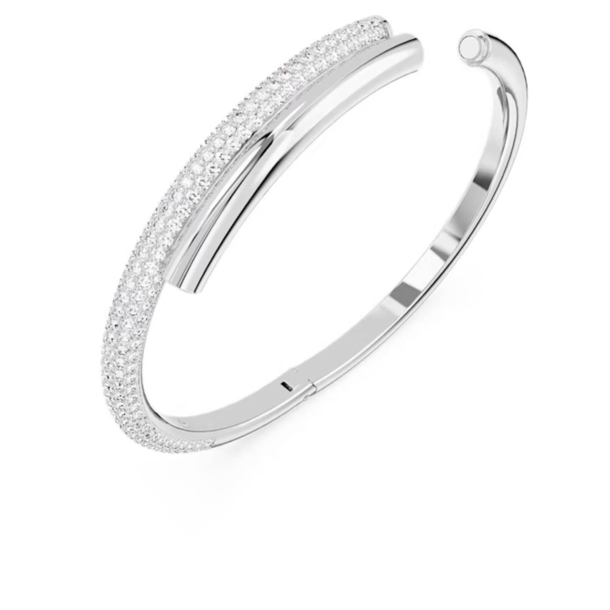 Deze gekruiste armband met een elegante lus om de pols zorgt voor een maximale impact. Het tubulaire ontwerp biedt de perfecte combinatie van klassieke en moderne stijlen, met een band met een rhodium toplaag die half is gedecoreerd met all-over helder kristalpavé. De armband is voorzien van een verborgen magneetsluiting, voor een perfecte afwerking. Een luxueus sieraad dat elke outfit die u draagt nog specialer maakt.