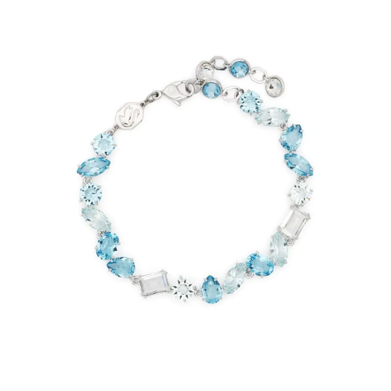 Deze Gema-armband in ijsblauwe tinten vormt een prachtige aanvulling op elke sieradenverzameling. Het ontwerp met een rhodium toplaag bestaat uit verschillende slijpvormen en kleuren die zijn geïnspireerd op een Boheemse stijl en vervaardigd met een luxueuze savoir-faire. Draag afzonderlijk voor glamoureuze look en combineer met andere sieraden uit deze fascinerende lijn voor een schitterende avondlook. Lengte: 17-22 cm