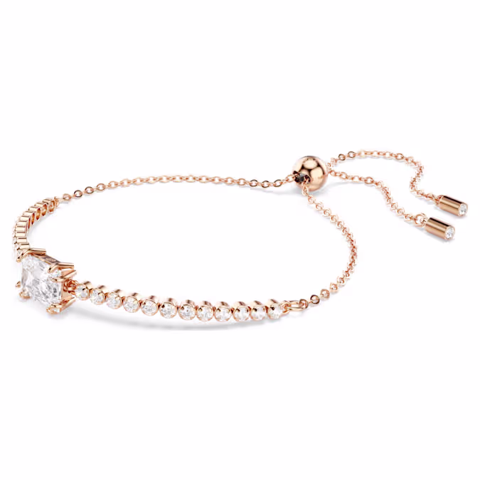 Deze klassieke Tennis-armband voegt een vleugje glans toe aan elke look. Het ontwerp met roségoudkleurige toplaag en schuifsluiting voor een verstelbare pasvorm heeft een gelijkmatige rij Swarovski Zirkonia en wordt geaccentueerd door een Swarovski Zirkonia in baguette-slijpvorm in het midden. Hiermee geeft u een levendige draai aan een tijdloze stijl die u keer op keer kunt dragen.