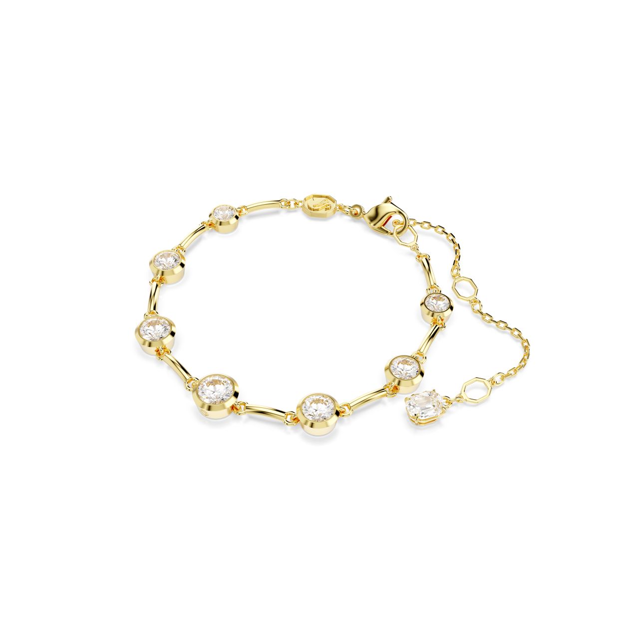Eenvoud regeert in deze elegante armband uit de Imber-lijn. Het ontwerp met goudkleurige toplaag is verfraaid met zeven Swarovski Zirkonia in Round-slijpvorm, elk geplaatst in een moderne bezelzetting. Voor een verstelbare pasvorm is de karabijnsluiting voorzien van drie verschillende posities en een enkele Swarovski Zirkonia aan het uiteinde van het verlengstuk. Draag deze armband met een bijpassende Imber-ketting voor een ultiem verfijnde look.