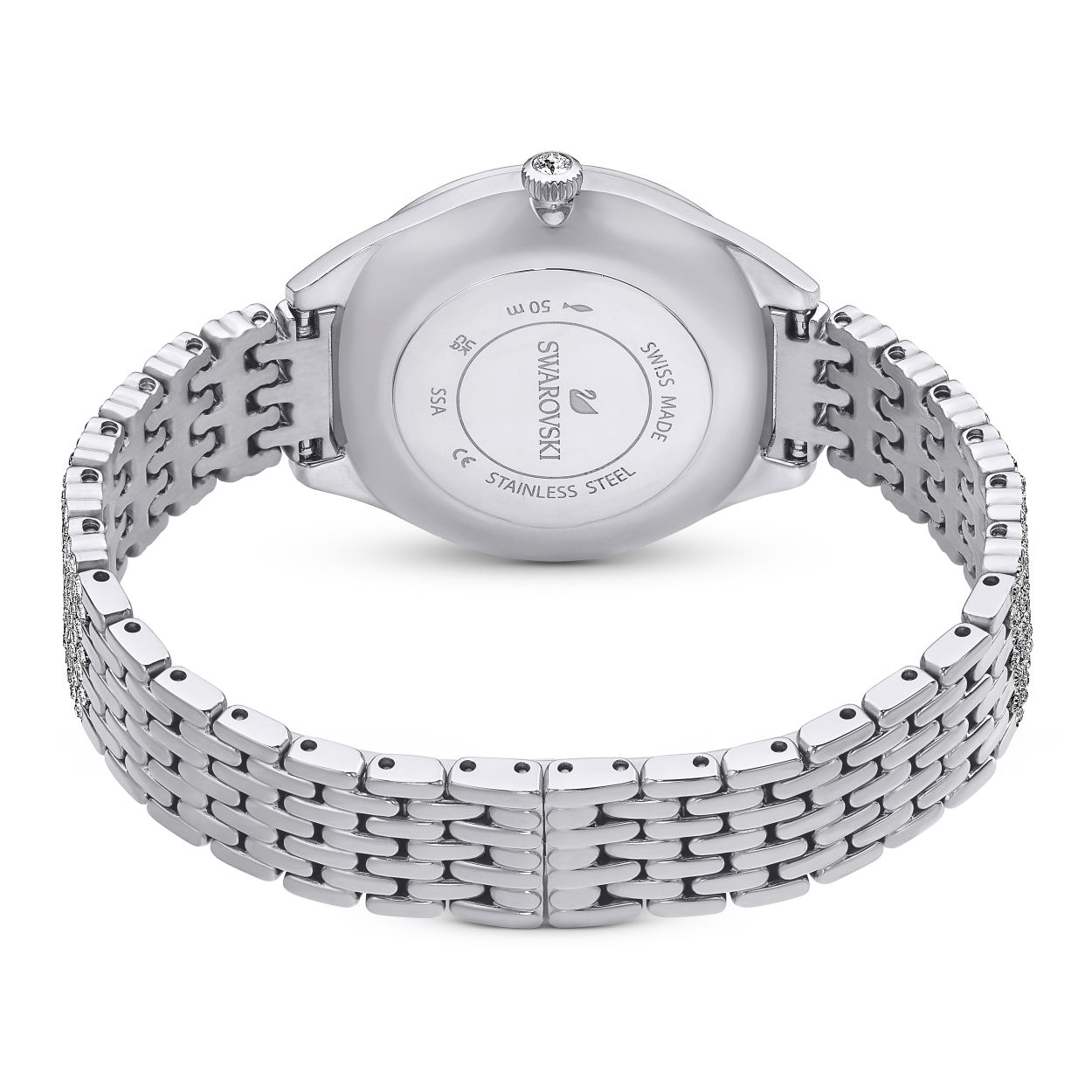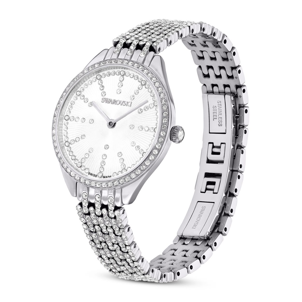 De eenvoud van edelstaal wordt op prachtige wijze benadrukt in dit Swiss Made-horloge dankzij het schitterende gebruik van 433 kristallen. De zilverkleurige wijzerplaat met guilloche bevat kristallen uuraanduidingen, en de smalle lunette en armband bevatten elk een eigen pave van stralende heldere kristallen. Het horloge van 30 mm is waterbestendig tot 50 m. en is voorzien van een steen in de kroon. De algehele look is ontworpen om een subtiel en toch merkbare impact te maken op elke outfit die u draagt.