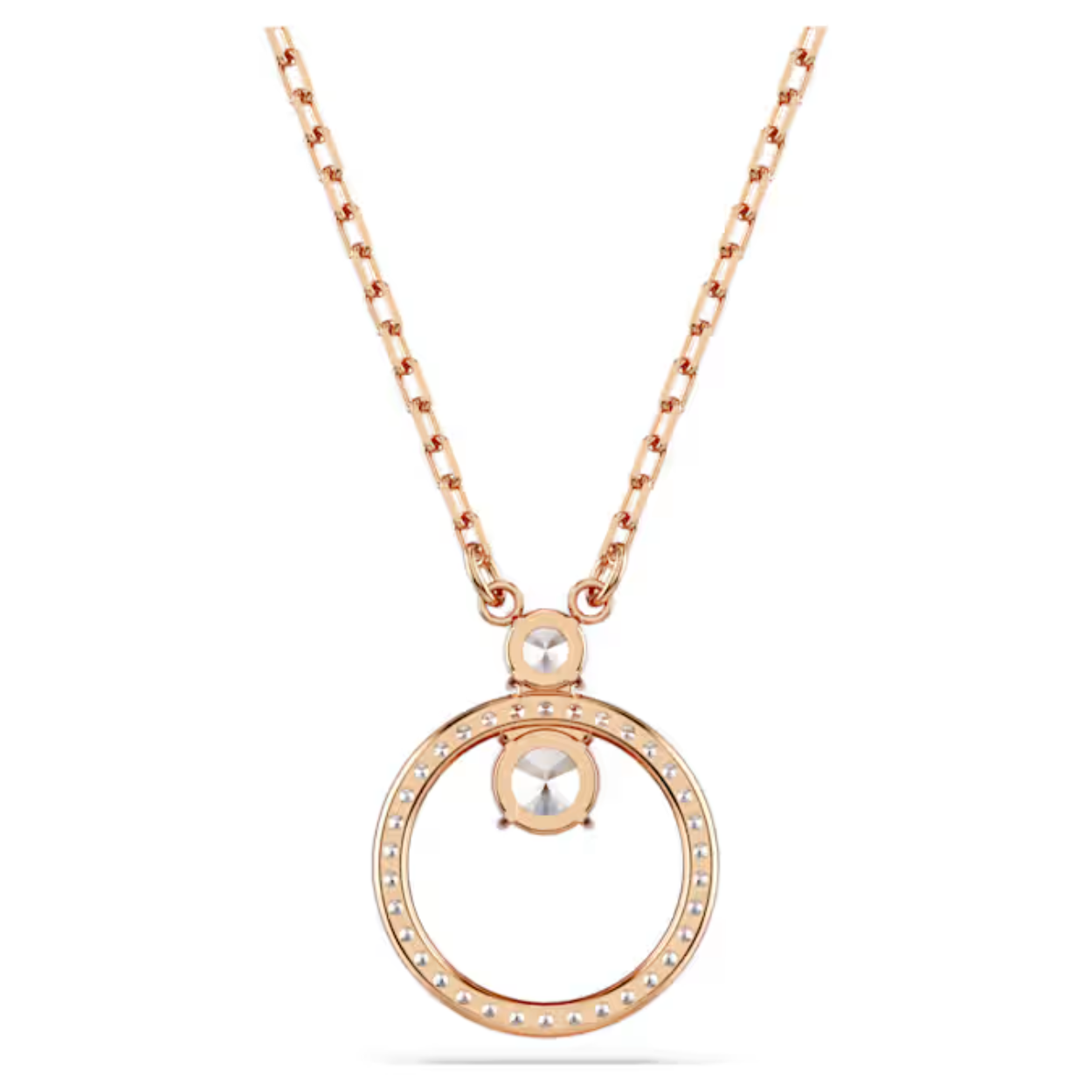 Dit sieraad met roségoudkleurige toplaag biedt een moderne kijk op de klassieke cirkelvormige hanger en heeft een centrale ring met een pavé van heldere Swarovski Zirkonia, die door twee grotere Swarovski Zirkonia in klauwzetting op zijn plaats wordt gehouden. Deze dynamische maar elegante hanger kan alleen worden gedragen of in combinatie met een bijpassende set Constella-oorbellen.