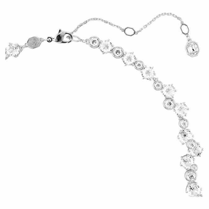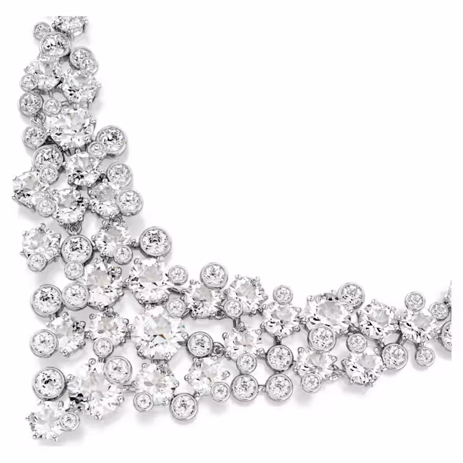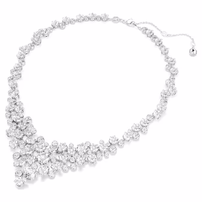 Til uw glans naar een hoger niveau met deze adembenemende v-vormige ketting. Het ontwerp met rhodium toplaag is als een cluster van stralende sterren en heeft meerdere lagen heldere Swarovski-kristallen die de voorkant van elke outfit beeldschoon accentueren. De karabijnhaaksluiting zorgt voor een verstelbare pasvorm, waardoor u een wonderbaarlijke accessoirekeuze heeft voor uw seizoensgebonden feesten.