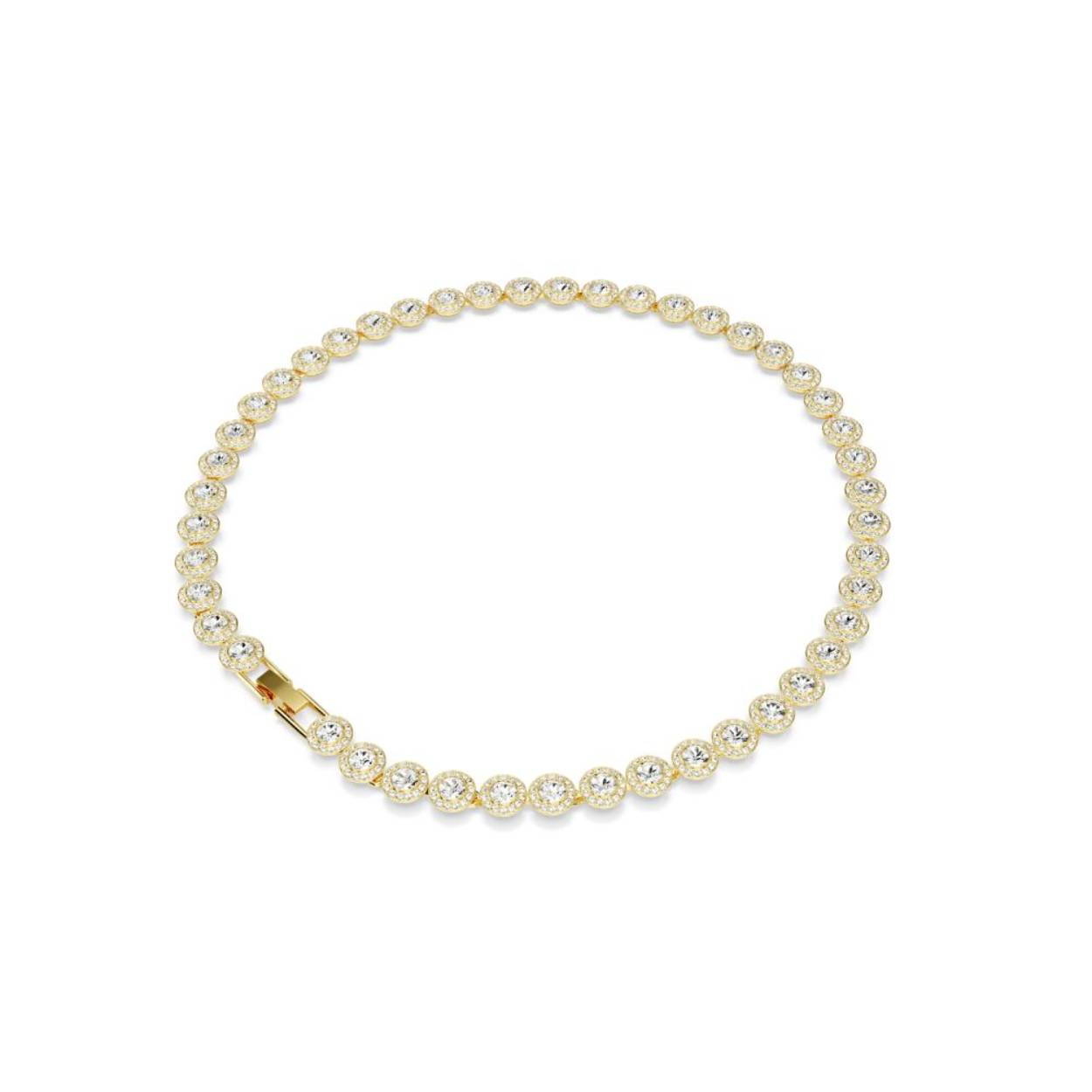 Deze stralende Una-ketting, die een look van tijdloze elegantie belichaamt, is een van Swarovski’s meest geliefde silhouetten. Het ontwerp met goudkleurige toplaag is voorzien van een rij grote kristallen in Round-slijpvorm die zijn omlijst door een ring van heldere pavé. De vouwsluiting zorgt voor een naadloze afwerking, terwijl u met het extra extender het sieraad kunt aanpassen aan uw comfort en maat. Een perfecte manier om uw stijl van dag tot nacht extra glans te geven.