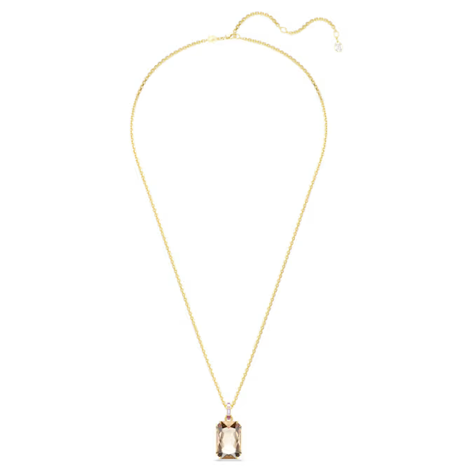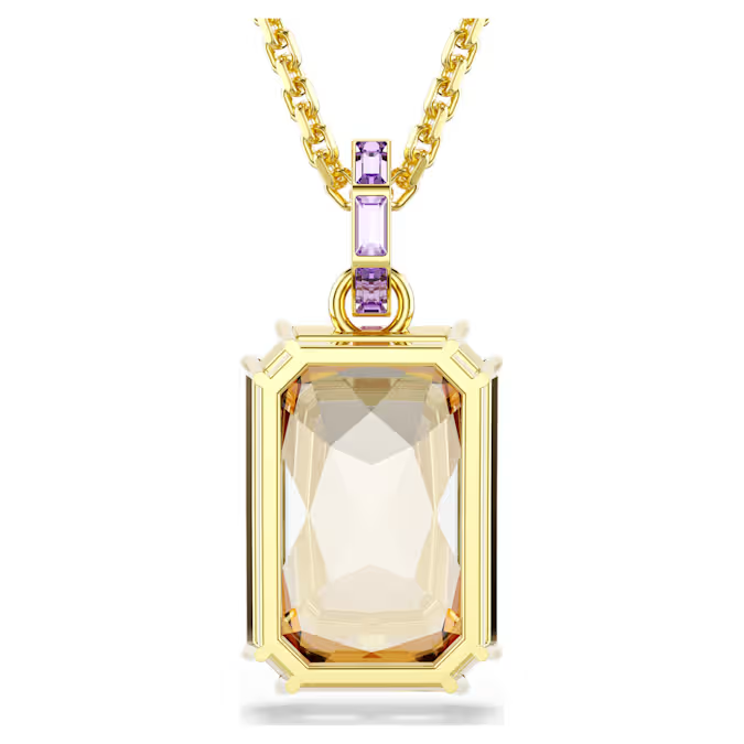 Deze schitterende Millenia-hanger is een creatie van pure warmte en luxe. Het centrale motief is vervaardigd uit een groot karamelkleurig kristal in een dubbele klauwzetting en is verbonden met het goudkleurige collier via een elegant oog versierd met paarse kristallen in sponningzetting. Combineer deze hanger met een bijpassend paar oorbellen of een armband voor een ultramoderne look.