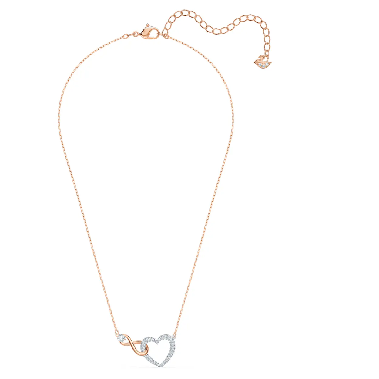Tijdloze romantiek: de symbolen van liefde en oneindigheid zijn samengebracht in deze elegante Swarovski-ketting. In dit prachtige item is een wit kristallen hart verweven met een oneindigheidssymbool met roségoudkleurige toplaag, wat een zichtbare uiting vormt van de belofte van eeuwige liefde. Een perfect cadeau voor je partner.