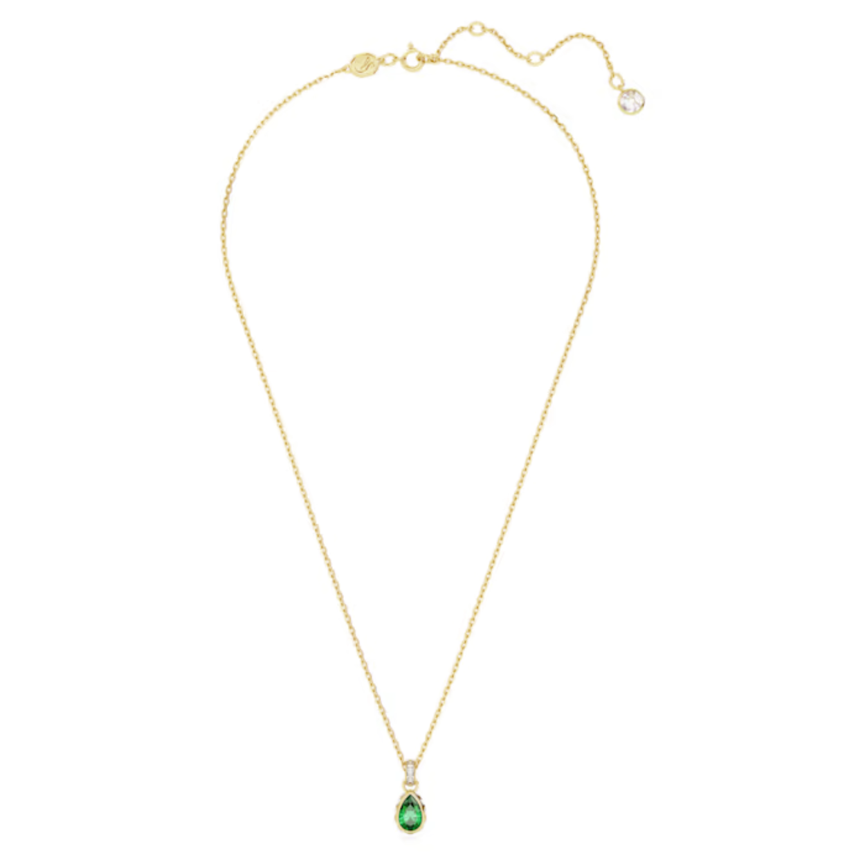 Deze schitterende hanger uit de Stilla-lijn is klein en toch opvallend mooi. De hanger bevat een groene steen met pear-slijpvorm in het midden die is gezet in een goudkleurige toplaag en wordt geaccentueerd door vierkante heldere kristallen langs de randen en het ringetje. Het sieraad hangt aan een ketting met goudkleurige toplaag, een ronde steen aan het uiteinde en verlengstuk van 5 cm, en kan elke dag gedragen worden als kenmerkend onderdeel van uw stijl.