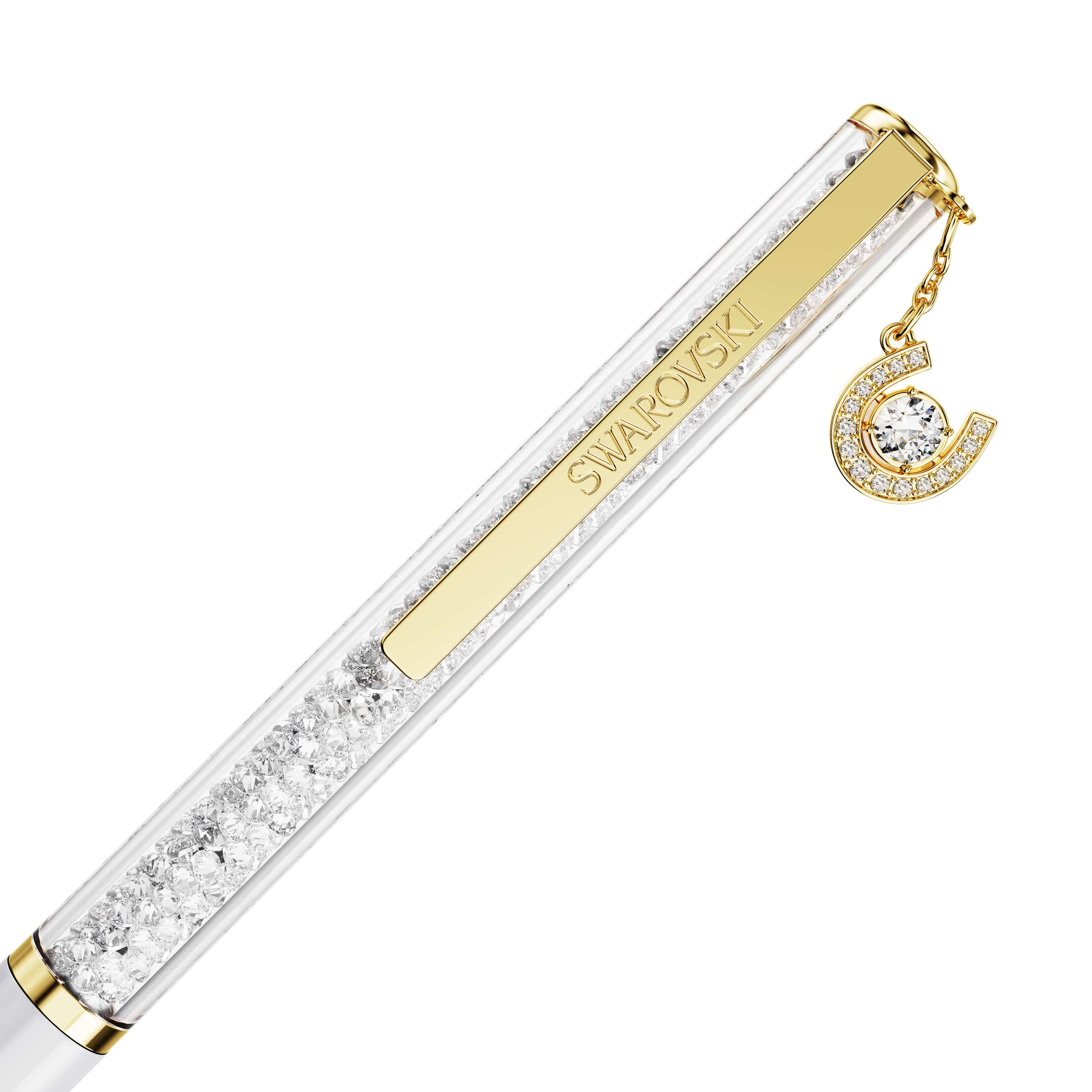 Deze slanke balpen is gevuld met ongeveer 400 heldere kristallen, die zichtbaar zijn door het lange transparante venster. Naast een gelakte witte behuizing heeft de pen een goudkleurige afwerking en een hoefijzerhanger, die al sinds jaar en dag in verschillende culturen wordt gekoesterd als symbool van bescherming en voorspoed. Door zijn tijdloze betekenis is deze pen een attent cadeau voor vele gelegenheden, of het nu is om iemand succes te wensen, een nieuw begin te vieren of gewoon als teken van positiviteit en zorgzaamheid. Vullingen met zwarte en blauwe inkt zijn verkrijgbaar in de Swarovski-stores.