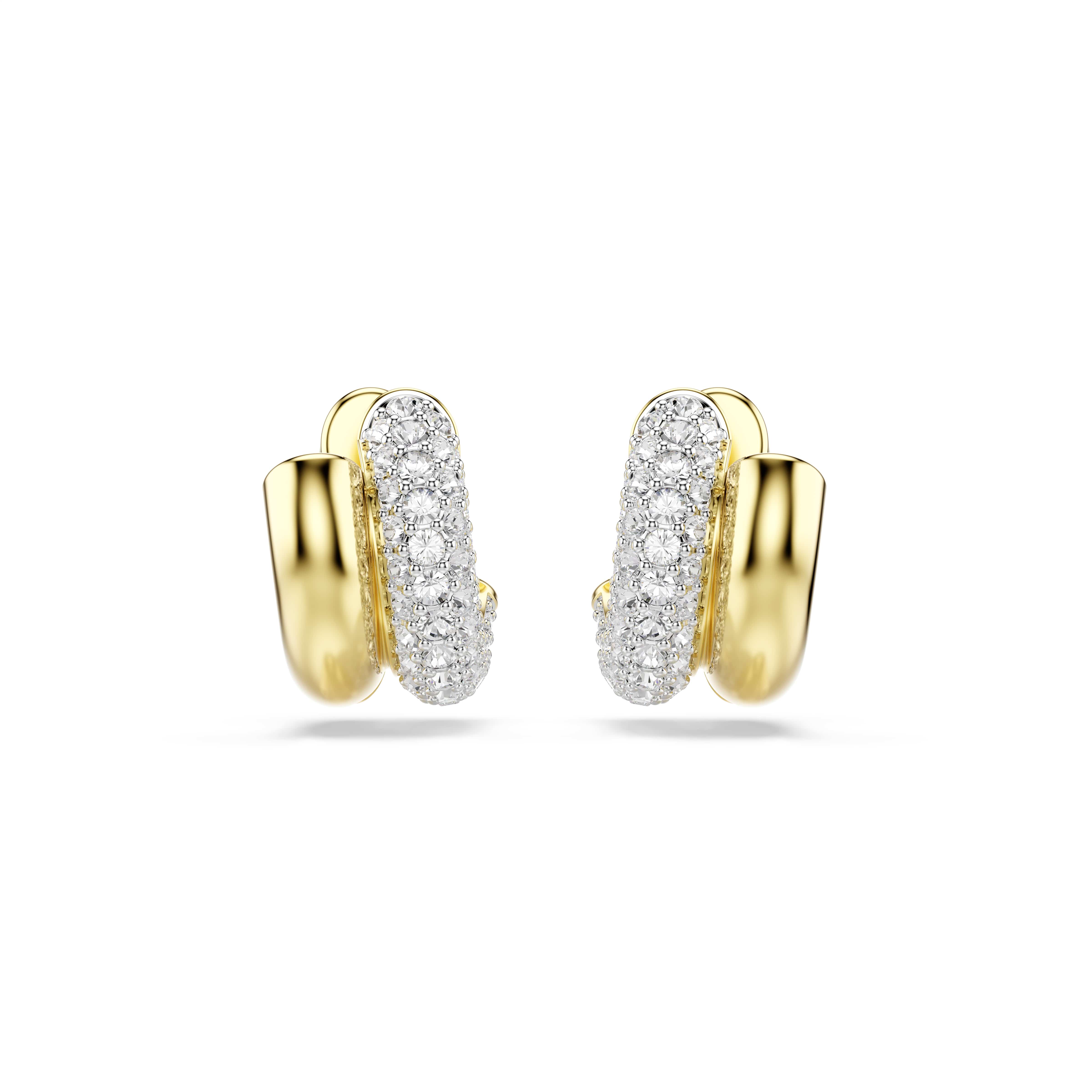 De buisvormige oorbellen belichamen de industriële stijl van Dextera en combineren een glanzende goudkleurige toplaag met een pavé van heldere kristallen aan één zijde. Een extra veersysteem zorgt ervoor dat elk sieraad gemakkelijk aan en uit te doen is. Draag deze mini-oorringen als een onderscheidende keuze om dag en nacht in stijl te blijven.