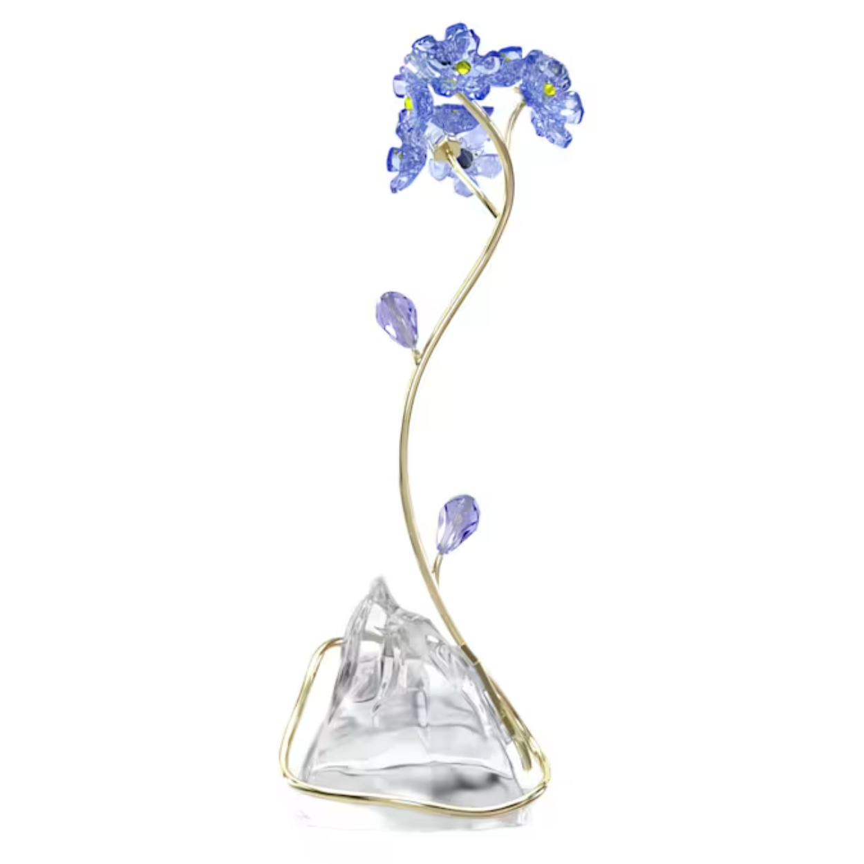 Deze oogverblindende creatie is vervaardigd met onmiskenbare vakkundigheid en weerspiegelt de schoonheid van een van de meest opvallende bloemen in de natuur. Het blauwe vergeet-mij-nietje is voorzien van 876 oplichtende facetten op een goudkleurige metalen stengel die zich elegant om een voetstuk van natuurlijk kristal zonder facetten wikkelt. Dit vrijstaande ontwerp vertegenwoordigt ware liefde en trouw en is een indrukwekkend cadeau voor een geliefde als permanente herinnering dat u aan die persoon denkt. Er is geen vaas of onderstuk nodig. Decoratief voorwerp. Geen speelgoed. Niet geschikt voor kinderen jonger dan 15 jaar.