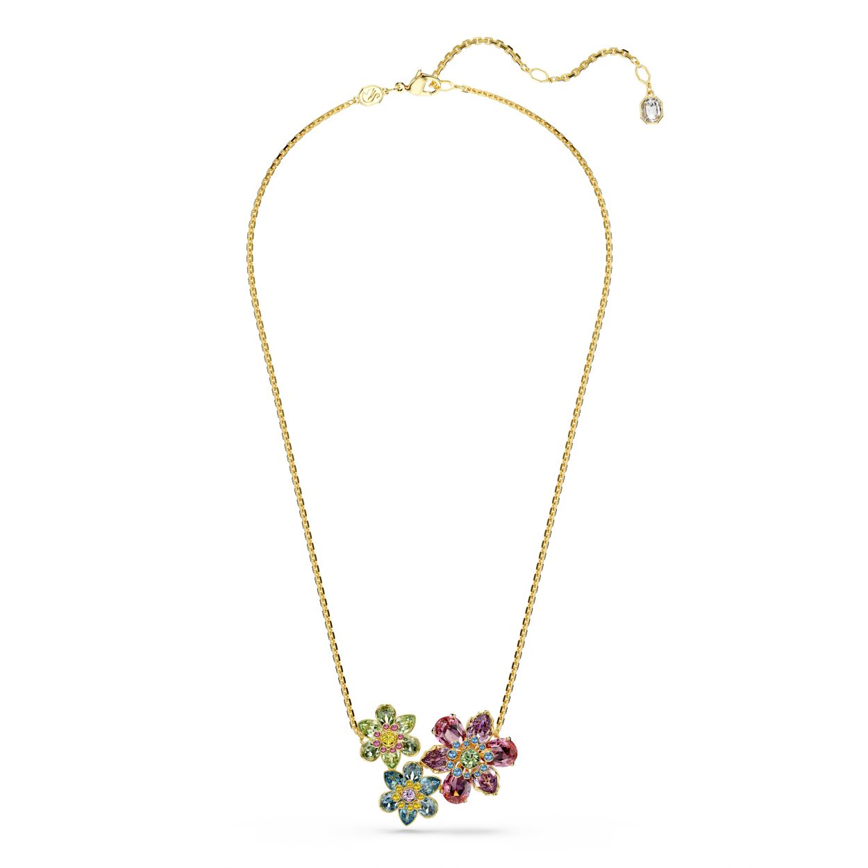 Deze prachtige hanger, met een schitterend boeket van drie bloemen, brengt rust en natuur in uw stijl. Het centrale motief hangt aan een ketting met goudkleurige toplaag en is versierd met kristallen in verschillende vormen en kleuren, wat zorgt voor een vrolijk en opbeurend effect. Een wondermooi sieraad om apart te dragen of te combineren met een bijpassende Idyllia-ring.