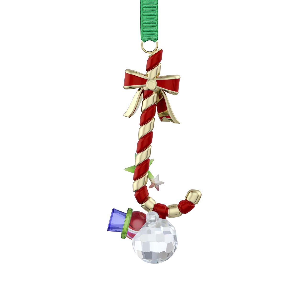 Dit speelse en charmante ornament in de vorm van een zuurstok is een gekristalliseerde zoete traktatie. Het ontwerp bestaat uit een glinsterende zuurstok waaraan een sneeuwpop hangt. Het heeft 266 facetten in feestelijke tinten. Het ontwerp hangt aan een groen ripsband lint en is afgewerkt met glimmende metalen accenten. Geef het cadeau aan een geliefde of leg het onder de boom om een glimlach op het gezicht van de ontvanger te toveren. Decoratief voorwerp. Geen speelgoed. Niet geschikt voor kinderen onder de 15 jaar.