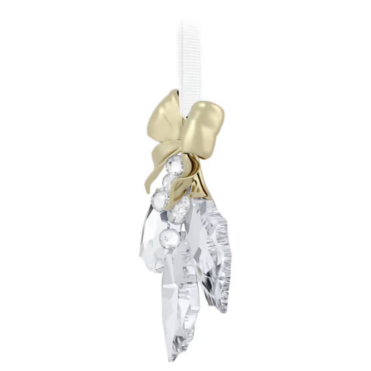 Dit ornament in de vorm van hulstblaadjes vormt een elegante toevoeging aan uw kerstdecoraties en is een verfijnde keuze. Het ontwerp schittert met 868 facetten en heeft een prachtige champagnegoudkleurige metalen strik aan een wit ripsband lint. De zeven extra kristallen doen dienst als bessen. Hang dit stuk in uw kerstboom om een schitterend spektakel te creëren. Decoratief voorwerp. Geen speelgoed. Niet geschikt voor kinderen onder de 15 jaar.