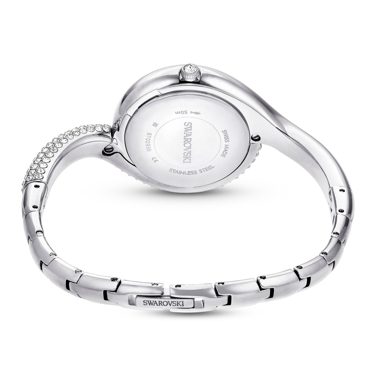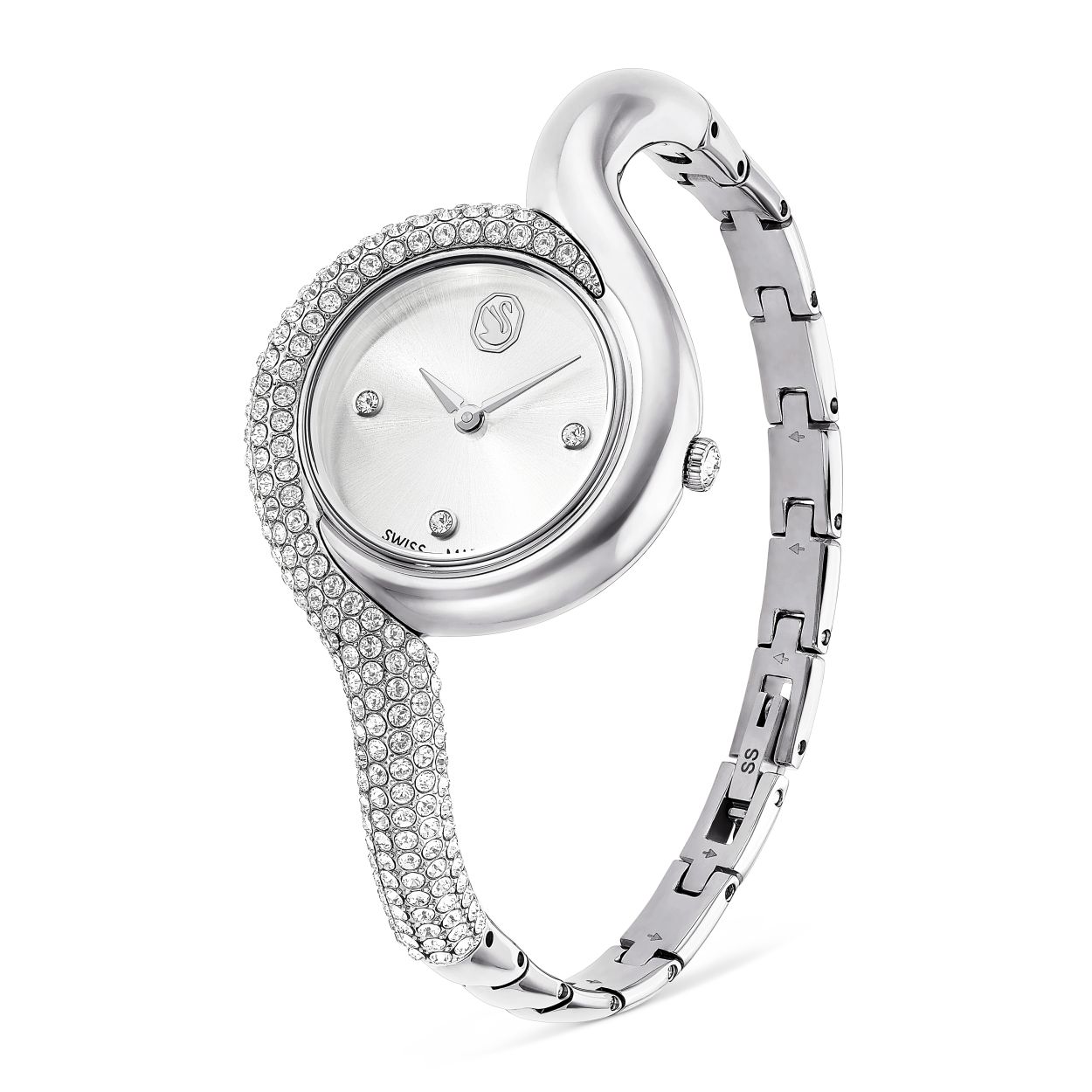 Dit fascinerende Dextera-horloge is ge�nspireerd op de klassieke uurwerken uit een vintage tijdperk. Het edelstalen ontwerp van 29 mm is creatief versierd met een pav� van heldere kristallen over de helft van de bezel en de helft van de armband. De minimalistische wijzerplaat heeft een zonnestraleneffect en wordt alleen geaccentueerd door drie kristallen uurmarkeringen en een zwaanlogo op 12 uur. Er zijn in totaal 203 kristallen gebruikt bij de creatie van dit horloge, inclusief het kristal in de kroon. Dit Swiss Made horloge is waterbestendig tot 50 meter en is een pure uiting van de verfijning van Swarovski.