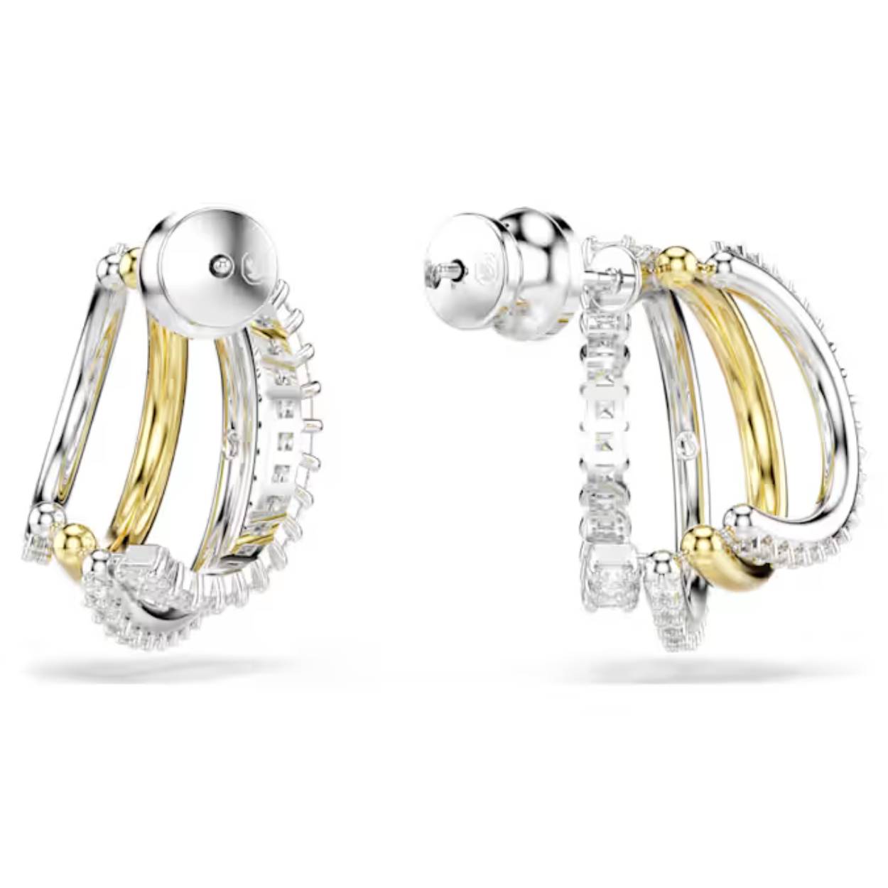 In deze complexe Hyperbola-oorbellen steken schoonheid en harmonie tegen elkaar af. Aan elke kant zijn de vier miniringen voorzien van verschillende metaalafwerkingen, waaronder een goudkleurige en rhodium toplaag. Hierin prijken Swarovski Zirkonia in Round- en Square-slijpvorm in een klauwzetting. Draag ze met een bijpassende armband of ketting voor een dramatische uitstraling.