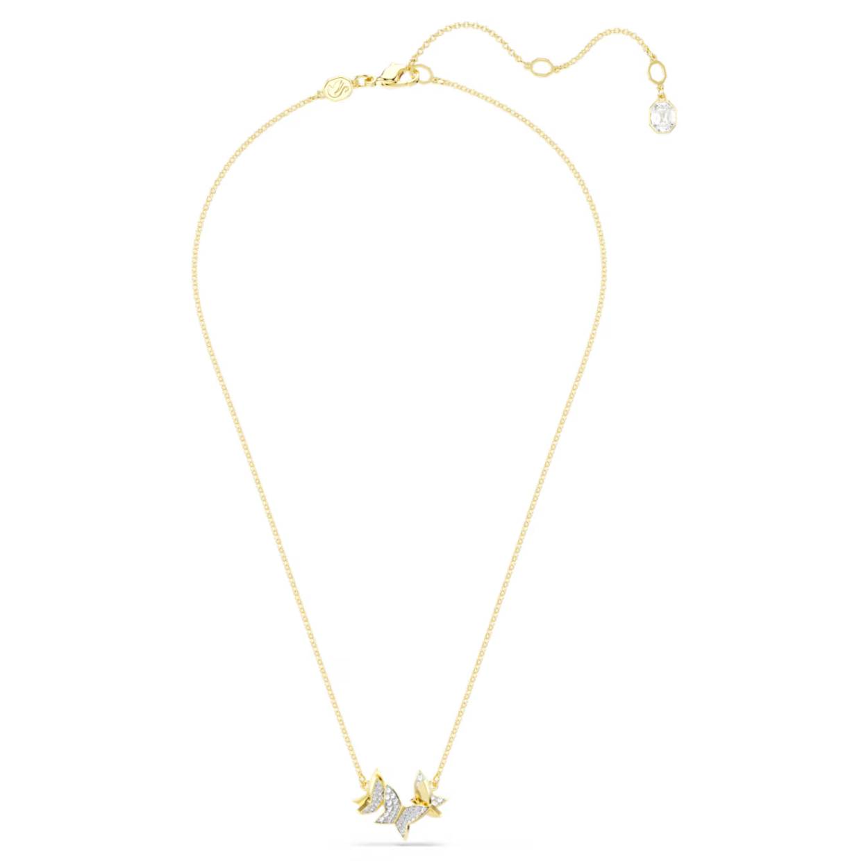 Deze verfijnde ketting is een elegante keuze voor elke dag en wordt gegarandeerd uw nieuwe favoriet. Het sieraad is voorzien van vlindermotieven in glinsterende pavé aan een ketting met goudkleurige toplaag. De perfecte aanvulling op witte T-Shirts, truien van kasjmier, denim of avondkleding: de mogelijkheden zijn eindeloos.