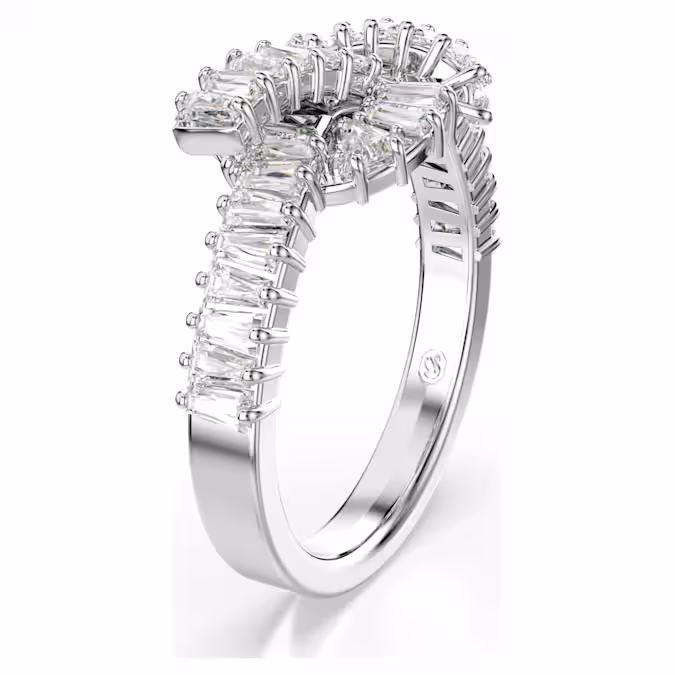 5727122Geef uw stijl een lichtvangende draai met deze elegante Matrix-ring. Het ontwerp met rhodium toplaag is vervaardigd met een knoop in de vorm van een lint en heeft een verfijnde versiering van Swarovski Zirkonia in baguette-slijpvorm, elk geplaatst in een klauwzetting. Deze moderne en artistieke ring past perfect bij andere sieraden uit dezelfde lijn.