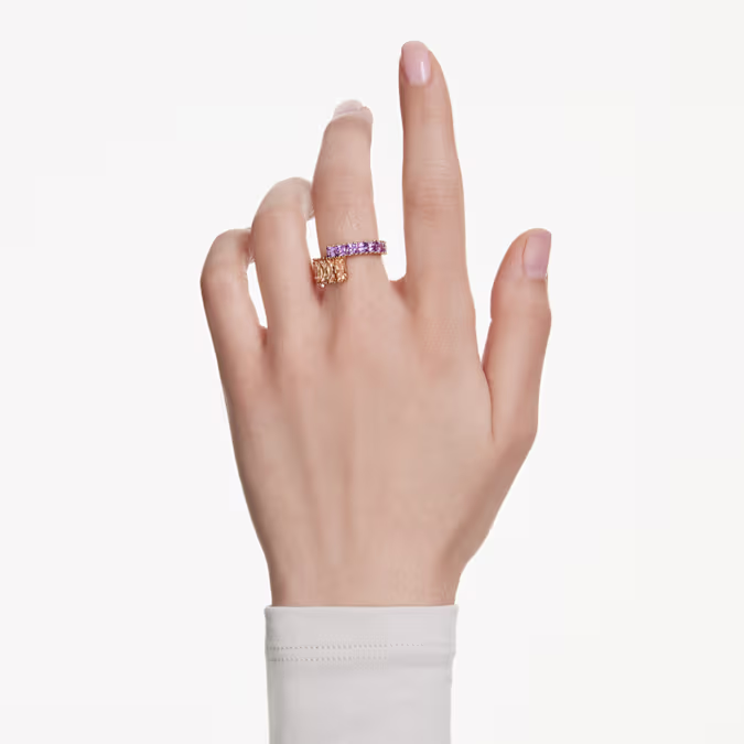 Deze majestueuze Matrix-ring biedt een botsing van kleuren en vormen. De overlappende band heeft een goudkleurige toplaag en is voorzien van karamelkleurige en paarse Swarovski Zirkonia in square- en baguette-slijpvorm. Een levendige keuze die prachtig combineert met de bijpassende armband.