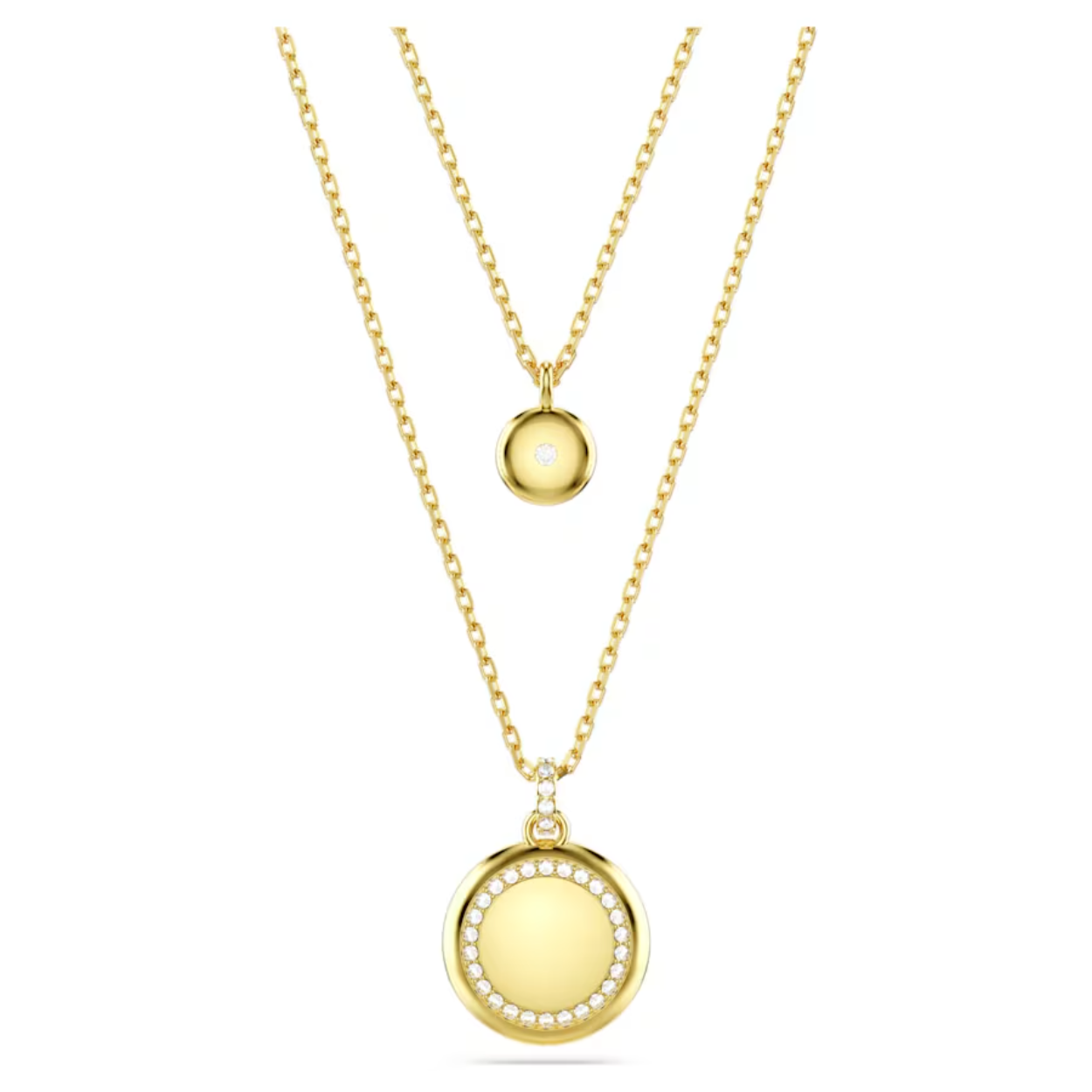 Deze schitterende gelaagde hanger is de ideale manier om uw stijl te laten oplichten. Het ontwerp met goudkleurige toplaag bestaat uit twee kettingen, elk met een bolvormig meteoormotief met een sneeuwpavé van heldere rondgeslepen kristallen in verschillende formaten. De hanger kan omgekeerd worden gedragen. Dan is de rand bezet met kristallen en prijkt er in het kleinere dessin een enkel kristal. Een prachtig cadeau voor uzelf of voor een geliefde.
