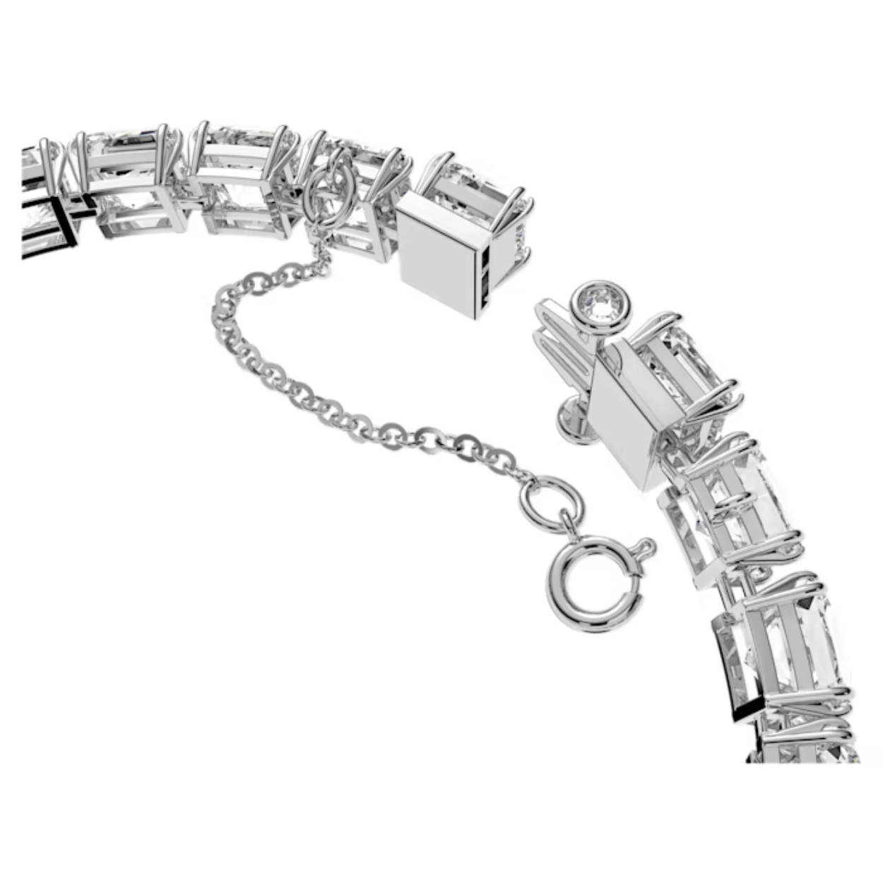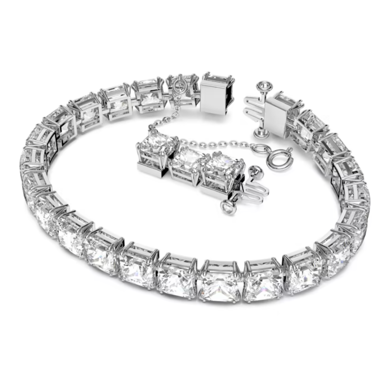 De dynamische armband is elegant vervaardigd van kristallen met een Square-slijpvorm in een klauwzetting met rhodium plating en is afgewerkt met een verborgen sluiting. Dit vloeiende sieraad met een luxe afwerking kan afzonderlijk gedragen worden of gecombineerd worden met andere armbanden uit de Millenia-lijn voor een opvallende en toch moderne look. Deze armband maakt onderdeel uit van de Millenia-lijn en is ontworpen door Creative Director Giovanna Engelbert voor Collection III. De sluiting open- en dichtmaken: schuif de haken in de bijbehorende gaten van de laatste steen en druk erop om ze vast te klikken. Gebruik de kleine sluiting om de veiligheidsketting vast te maken. Maak de veiligheidsketting los en druk tegelijkertijd op de knopjes aan de zijkanten van de steen om de haken los te maken.