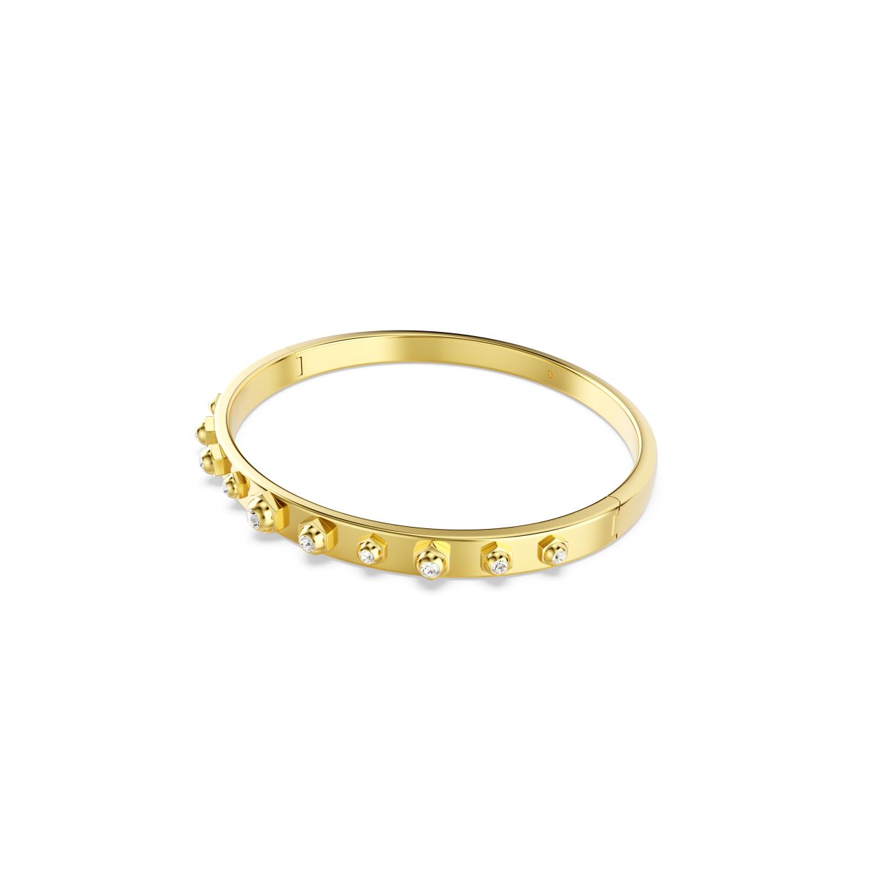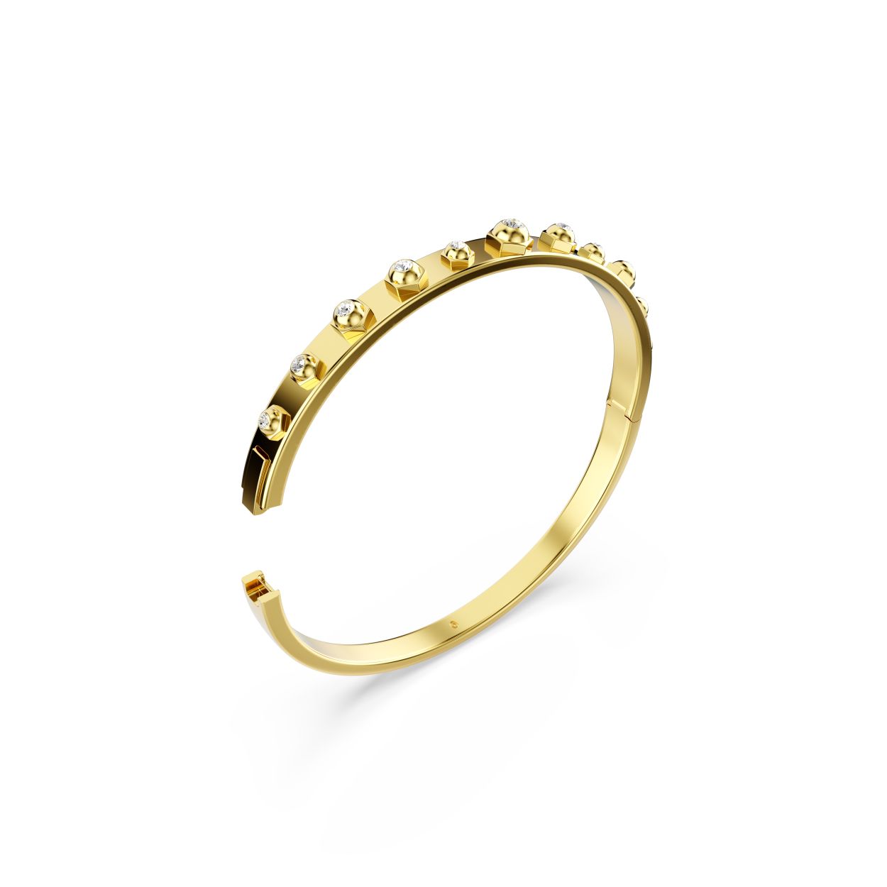Deze Numina-armband combineert een stralende schoonheid met een industriele stijl. Het metallic sieraad is vervaardigd met een goudkleurige toplaag en verfraaid met heldere ronde kristallen in verschillende afmetingen. Een uniek, opvallend ontwerp dat u zowel overdag als 's avonds kunt dragen.