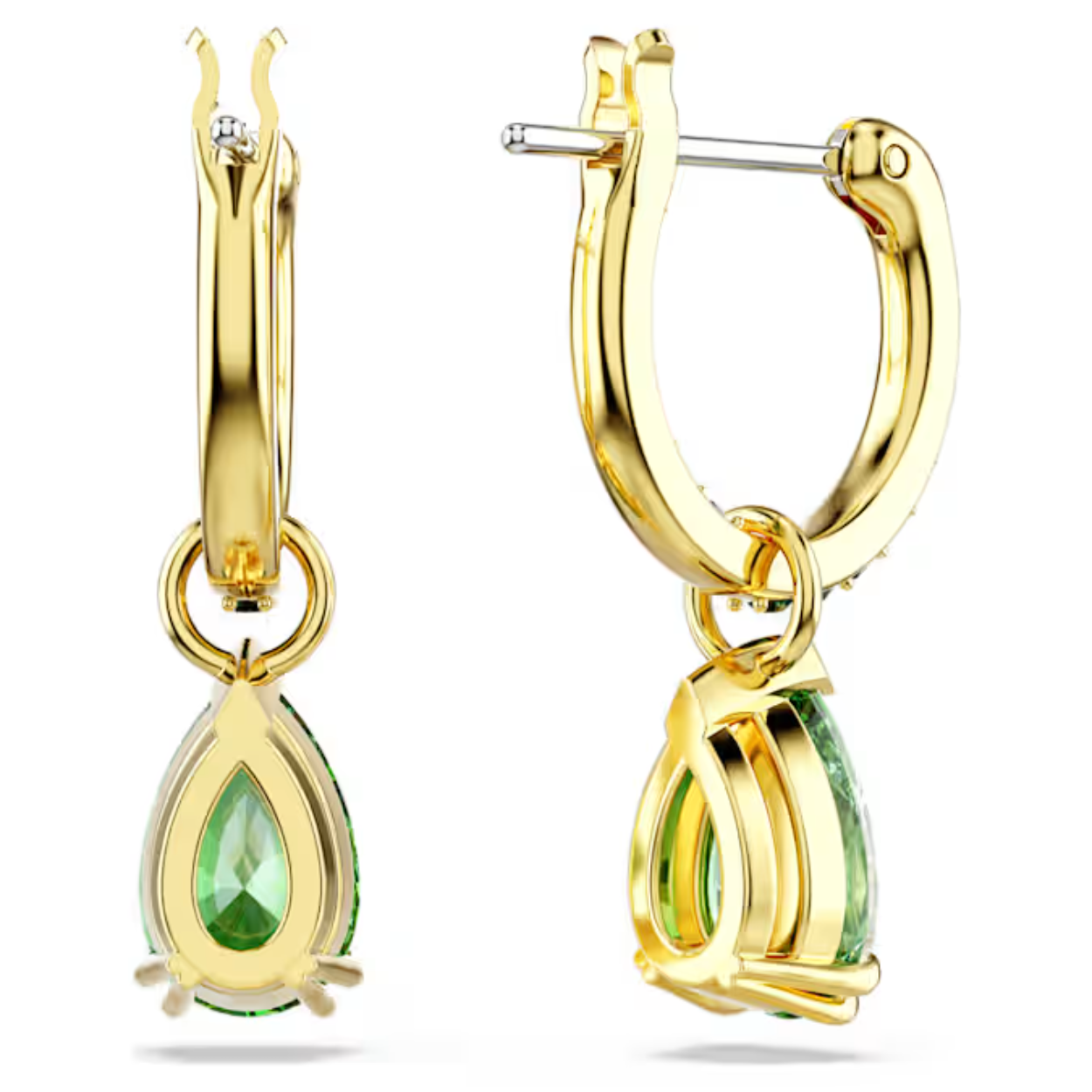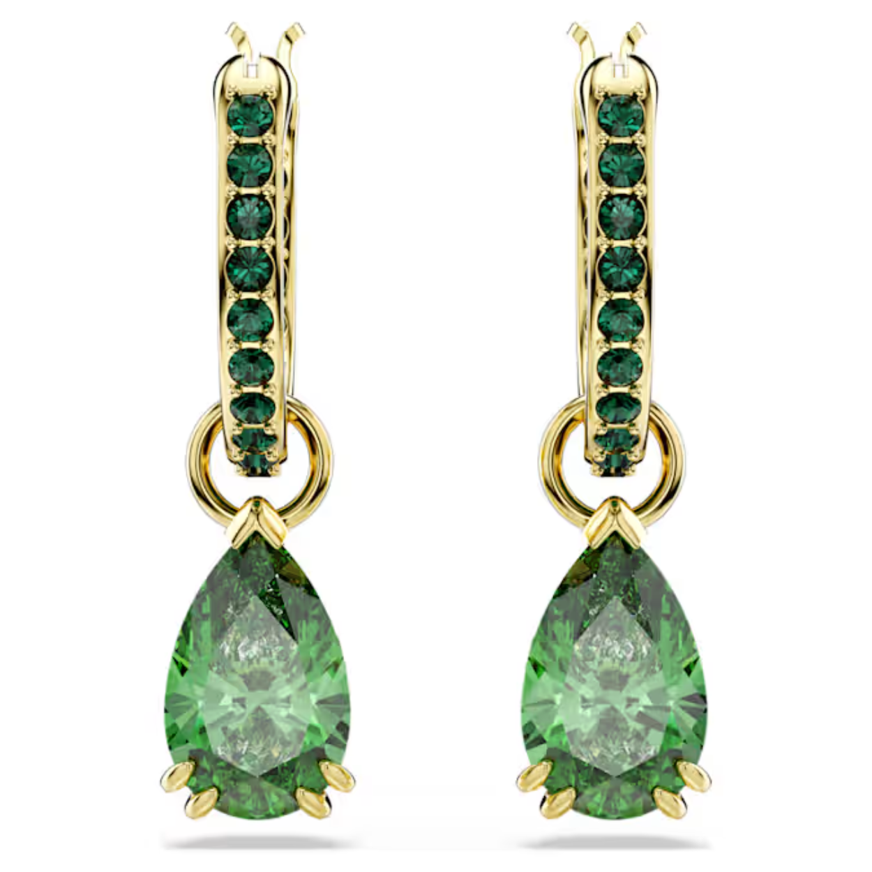 Deze oorbellen vangen het licht vanuit elke hoek en worden geheid uw nieuwe stijlfavoriet. Een groen kristal in Pear-slijpvorm hangt aan ringen met een goudkleurige toplaag, die zijn bezet met glinsterende groene pavé. Draag ze met opgestoken haar in combinatie met andere sieraden uit dezelfde lijn.