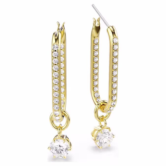 Vrolijk elke dag op met de glinsterende intensiteit van deze oorbellen met goudkleurige toplaag. Elke langwerpige ring is versierd met een schitterende pavé, met een Swarovski Zirkonia in klauwzetting die er elegant onder hangt. Een prachtig alternatief voor de klassieke oorringstijl, geïnspireerd door de elegante Constella-lijn.