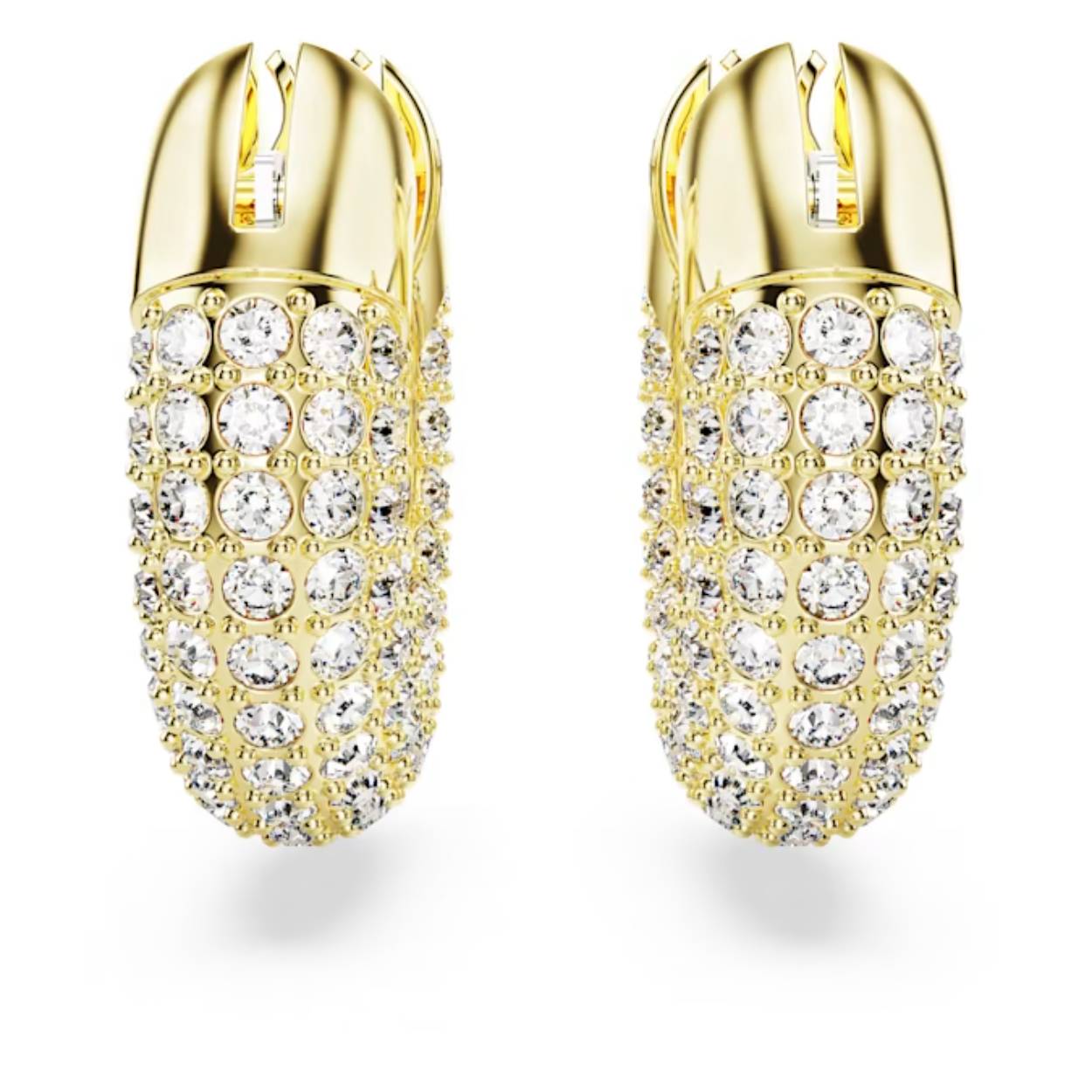 Klassieke ringoorbellen met een moderne twist: dit unisex paar geeft elke outfit een dynamische uitstraling. Het sculpturale design bevat glinsterende, gefolieerde kristallen gezet in een elegant goudkleurig frame en accentueert Swarovski's iconische pavétechniek. Draag dit statement-paar overdag én 's avonds voor een schitterende look. Deze oorbellen maken onderdeel uit van de Dextera familie en zijn ontworpen voor Collection III.