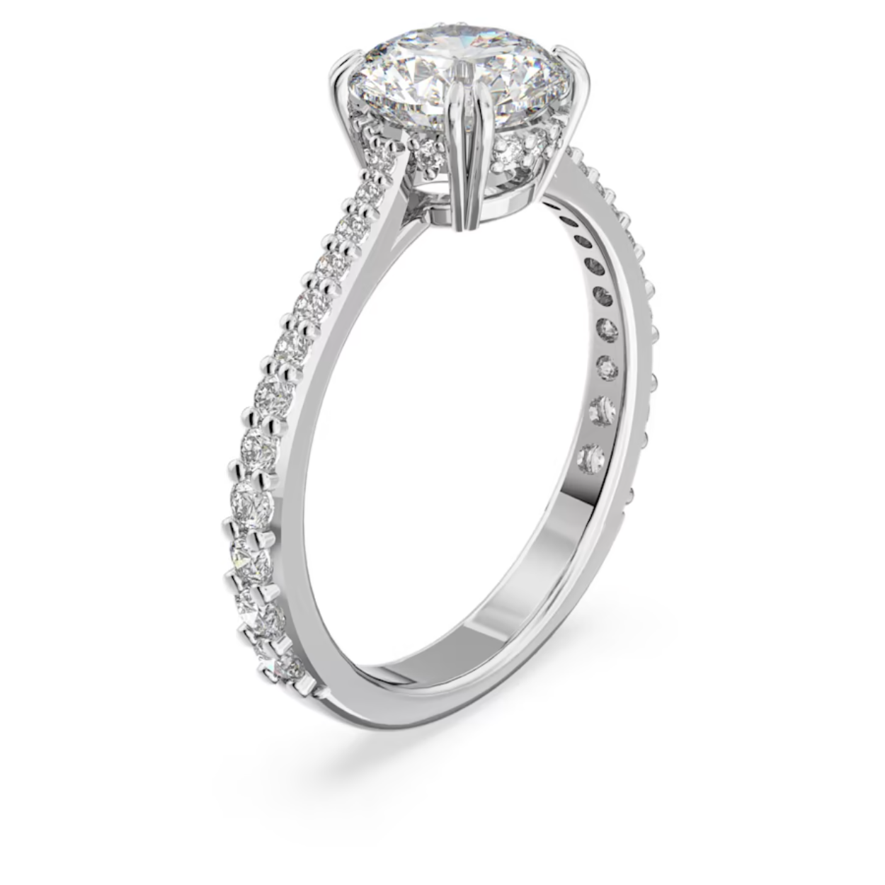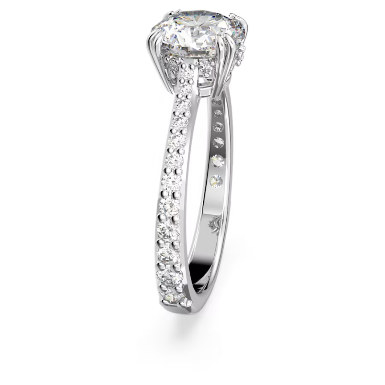 Deze Constella-ring bewijst dat eenvoud krachtig kan zijn en mag niet in uw collectie ontbreken. De vakkundig vervaardigde steen met princess-slijpvorm in het midden is voorzien van elegant pavé op de rijen en langs de band met rodium toplaag. Draag afzonderlijk en laat uw look stralen.
