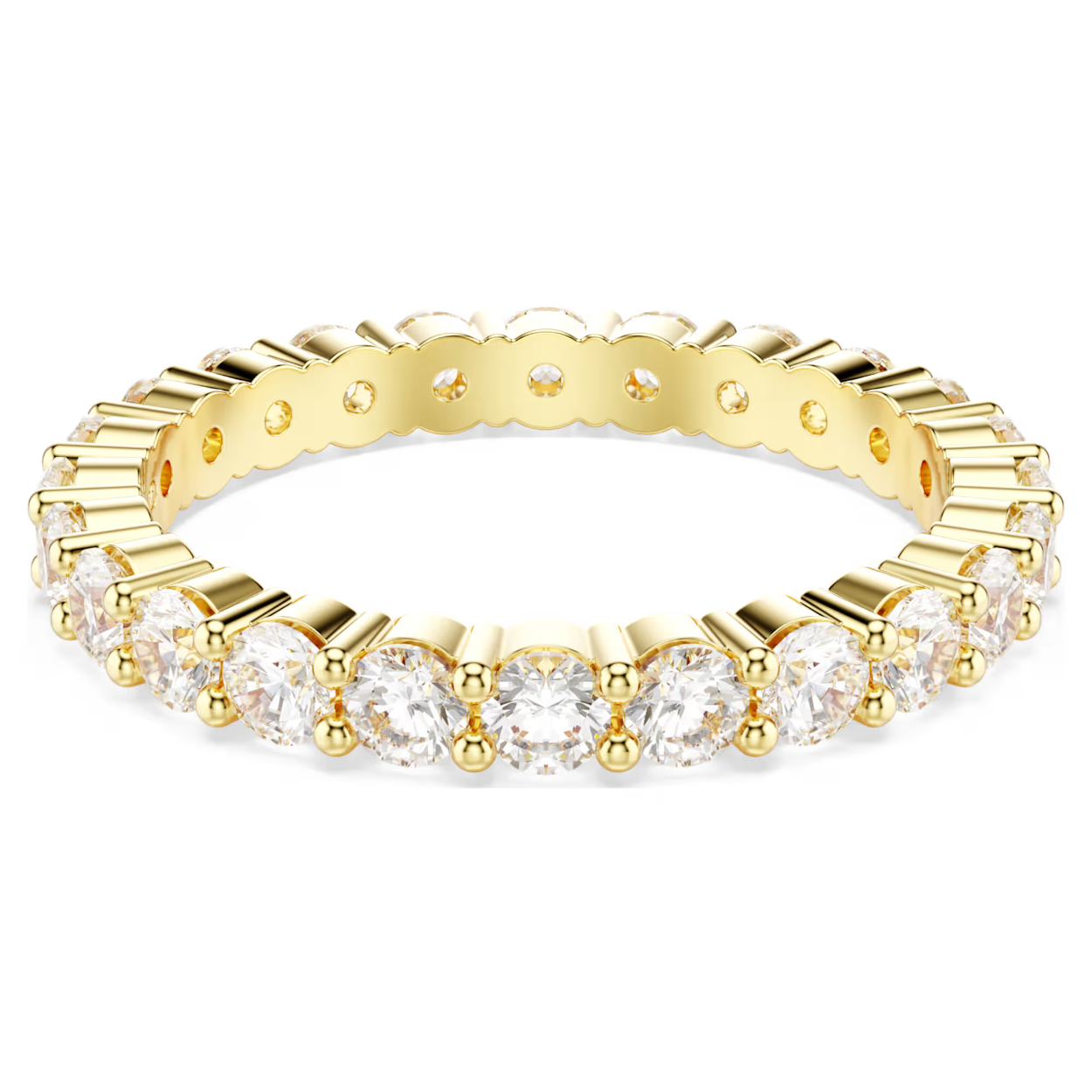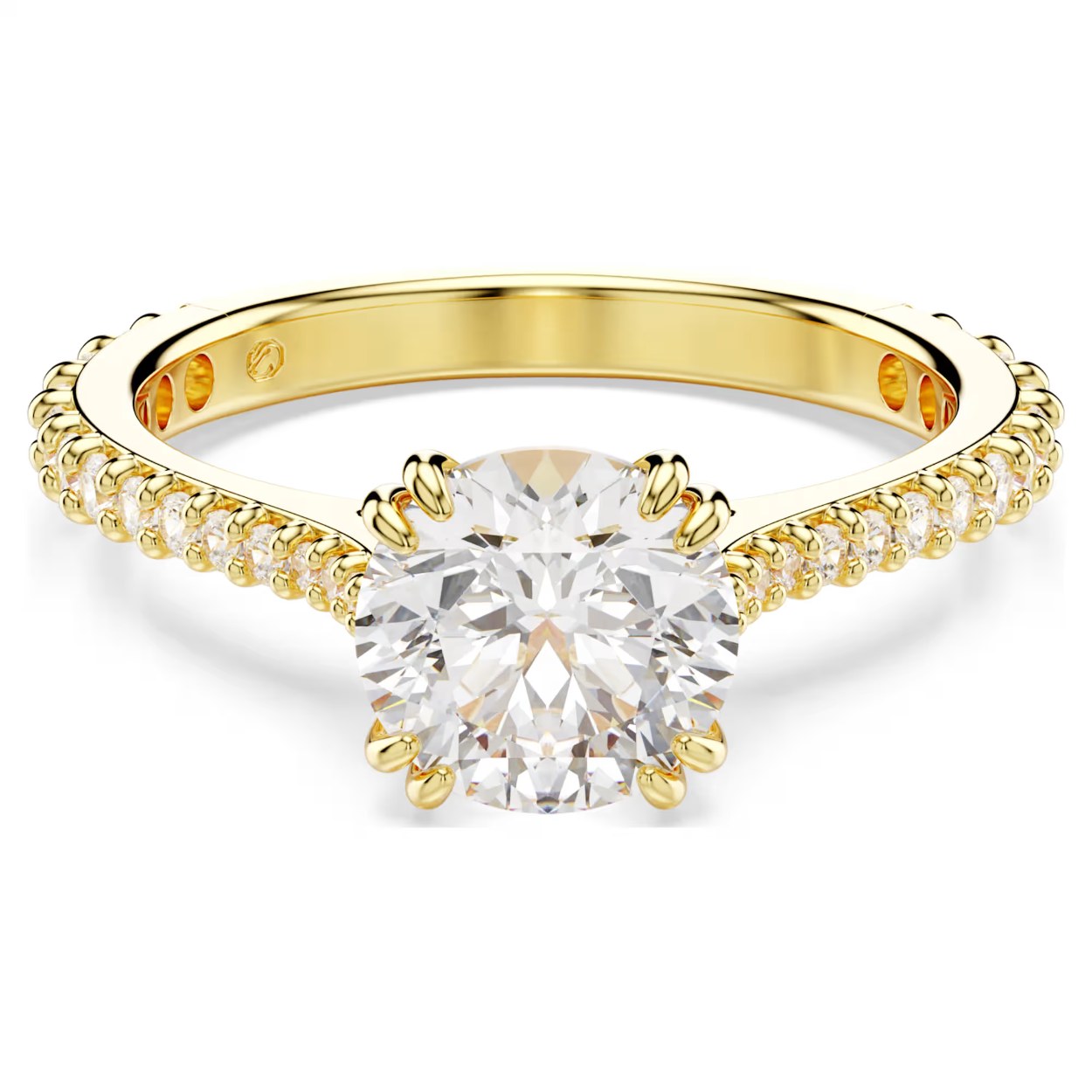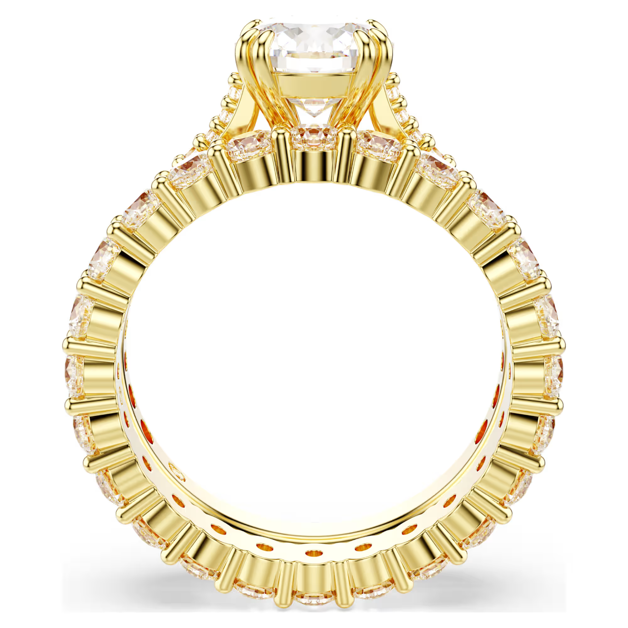 Dit spectaculaire sieraad weerspiegelt de schoonheid van de kosmos en bestaat in een eigen universum vol licht. Het ontwerp met goudkleurige toplaag combineert een bandring versierd met pavé met een solitaire-ring die ook met pavé is versierd. In het midden van de ring prijkt een grote Swarovski Zirkonia. Een stralend cadeau waarin de kenmerkende savoir-faire van Swarovski prachtig tot uiting komt.