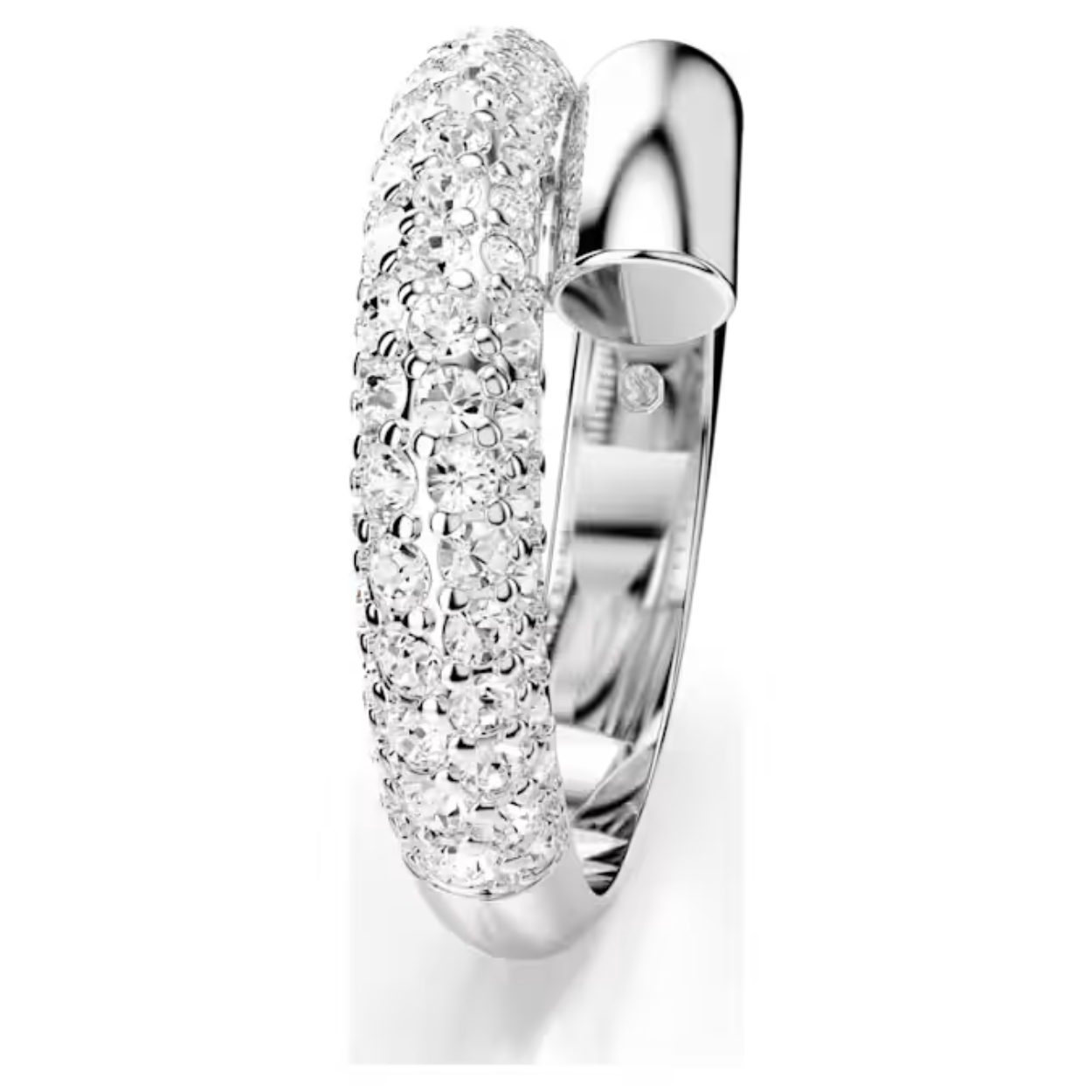 De schoonheid van deze technisch verfijnde Dextera-ring is te zien in elk detail. Het buisvormige ontwerp heeft een rhodium toplaag en is voor de helft ingelegd met een oogverblindend pavé van heldere kristallen. Combineer met een contrasterende goudkleurige ring voor een onconventionele look.