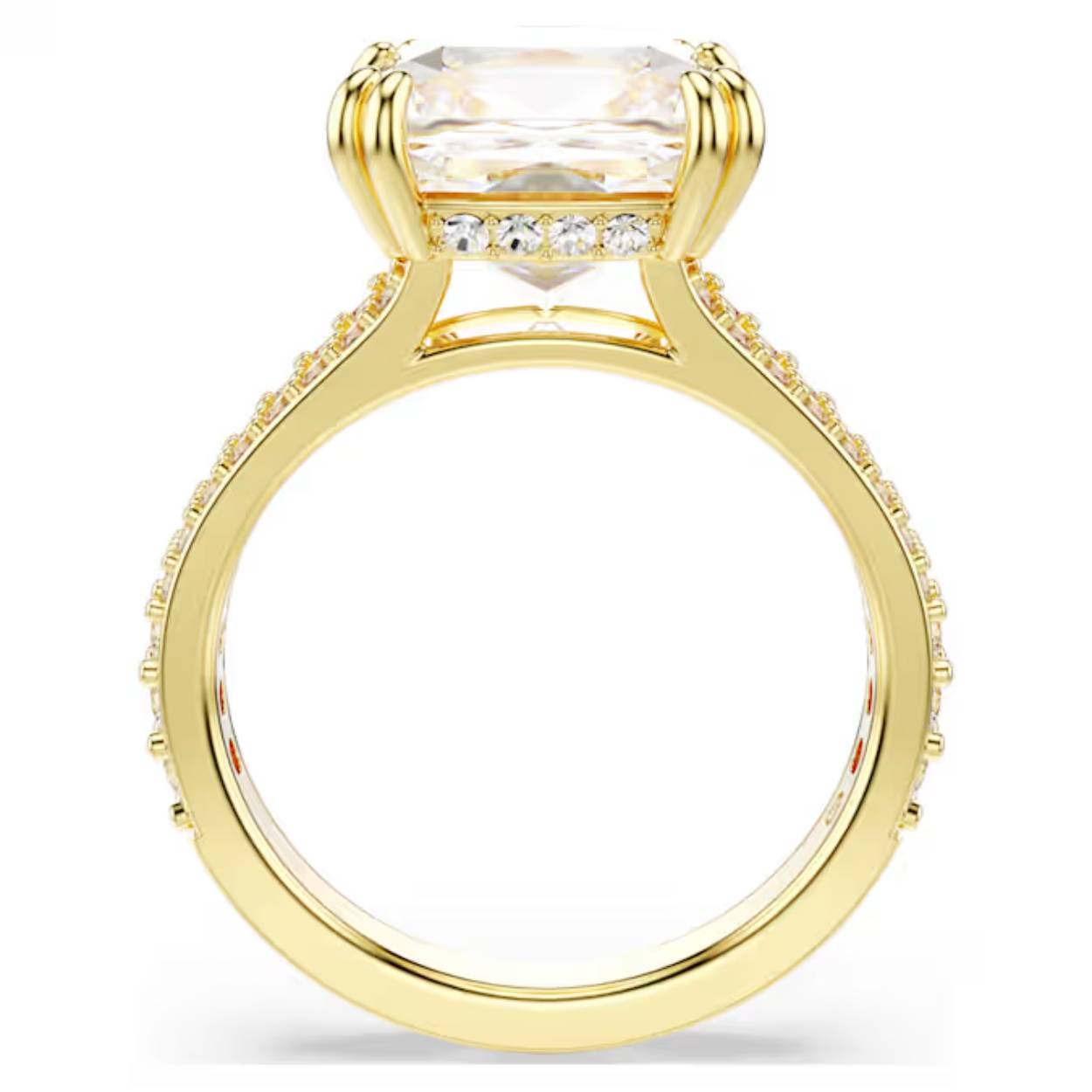 Deze spectaculaire cocktailring is gemaakt om in de spotlights te staan. Het biedt een perfect evenwicht tussen drama en verfijning met een prachtige Swarovski in 4KANTE-slijpvorm in dubbele klauwzetting. Het is afgewerkt met een met pavé bezette zijrand en band met goudkleurige toplaag.
