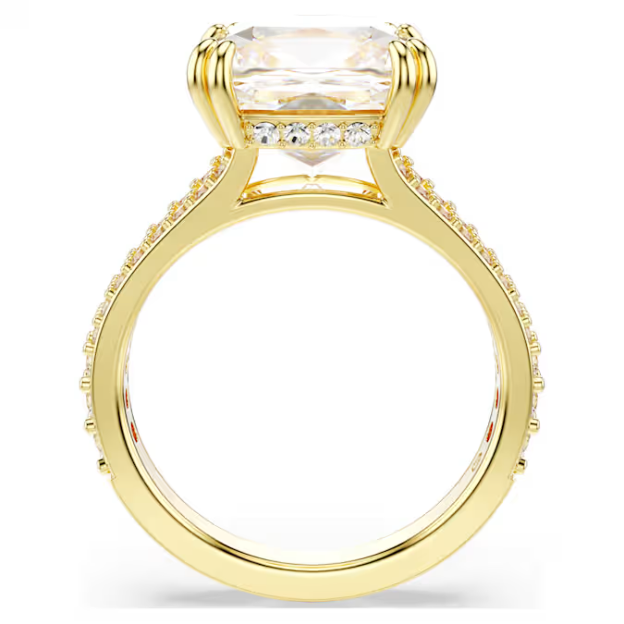 Deze spectaculaire cocktailring is gemaakt om in de spotlights te staan. Het biedt een perfect evenwicht tussen drama en verfijning met een prachtige Swarovski Zirkonia in vierkantige-slijpvorm in dubbele klauwzetting. Het is afgewerkt met een met pavé bezette zijrand en band met goudkleurige toplaag.