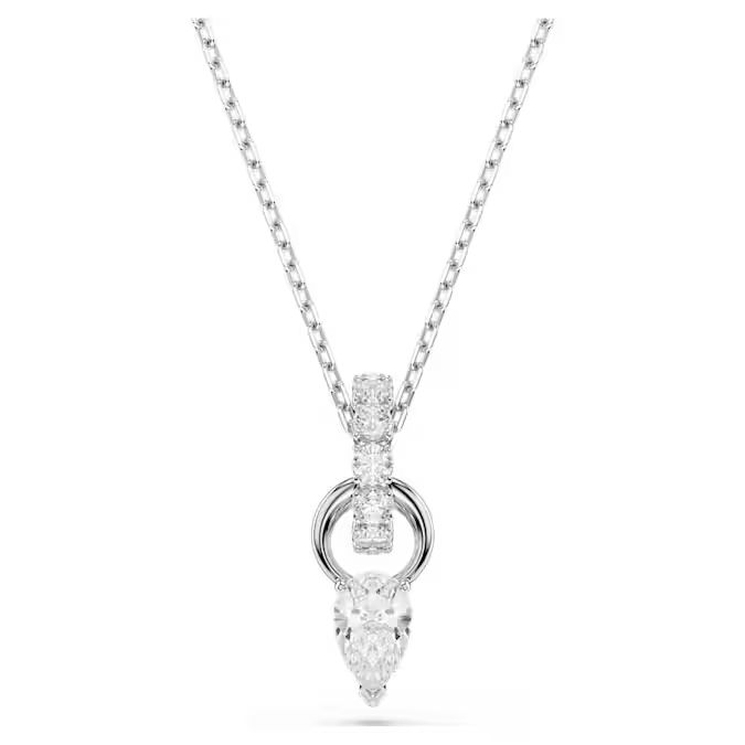 Geef uw stijl een gecoördineerde uitstraling met deze set van hanger en oorbellen. Elk glinsterend motief bestaat uit een Swarovski Zirkonia in de Pear-slijpvorm aan een kleine ring, die is verbonden met een andere ring met rhodium toplaag, versierd met Swarovski Zirkonia in Round-slijpvorm. Op de hanger zorgt een schuifmechanisme op de ketting ervoor dat de lengte gemakkelijk kan worden aangepast.
