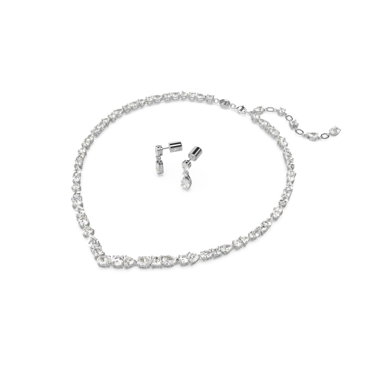 In deze showstelende sieradenset uit de Mesmera-lijn komen ultieme stijlvolle sieraden tot leven. De ketting bevat een streng opvallende Swarovski Zirkonia in een zetting met een rhodium toplaag en een verrassende combinatie van slijpvormen en maten. Het verlengstuk is voorzien van een karabijnsluiting en meerdere Swarovski Zirkonia voor een luxe uitstraling. De schitterende oorbellen hebben een rhodium toplaag en een opvallend hangend ontwerp met stralende kristallen met een pear-slijpvorm. Geef deze set cadeau aan een dierbare om de unieke stijl direct een boost te geven.
